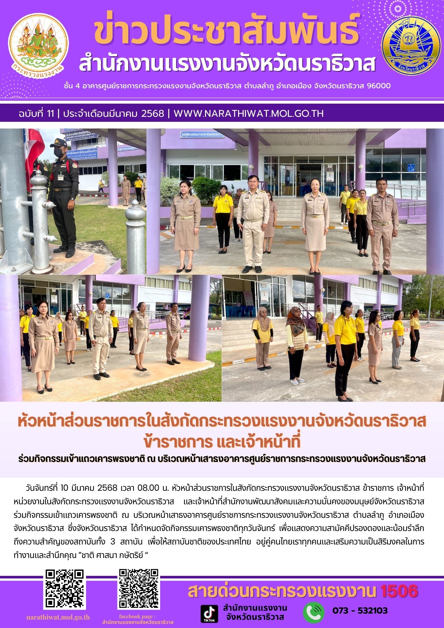 วันจันทร์ที่ 10 มีนาคม 2568 เวลา 08.00 น. หัวหน้าส่วนราชการในสังกัดกระทรวงแรงงานจังหวัดนราธิวาส ข้าราชการ เจ้าหน้าที่หน่วยงานในสังกัดกระทรวงแรงงานจังหวัดนราธิวาส และเจ้าหน้าที่สำนักงานพัฒนาสังคมและความมั่นคงของมนุษย์จังหวัดนราธิวาส ร่วมกิจกรรมเข้าแถวเคารพธงชาติ ณ บริเวณหน้าเสาธงอาคารศูนย์ราชการกระทรวงแรงงานจังหวัดนราธิวาส ตำบลลำภู อำเภอเมือง จังหวัดนราธิวาส ซึ่งจังหวัดนราธิวาส ได้กำหนดจัดกิจกรรมเคารพธงชาติทุกวันจันทร์ เพื่อแสดงความสามัคคีปรองดองและน้อมรำลึกถึงความสำคัญของสถาบันทั้ง 3 สถาบัน เพื่อให้สถาบันชาติของประเทศไทย อยู่คู่คนไทยเราทุกคนและเสริมความเป็นสิริมงคลในการทำงานและสำนึกคุณ “ชาติ ศาสนา กษัตริย์”