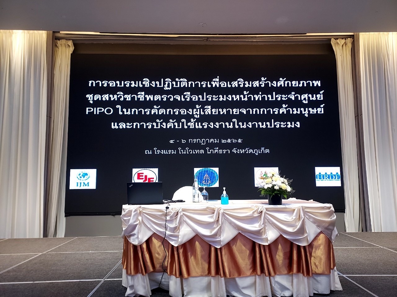 สรจ.ระนอง ร่วมอบรมโครงการอบรมเชิงปฏิบัติการเสริมสร้างศักยภาพชุดสหวิชาชีพตรวจเรือประมงหน้าท่าประจำศูนย์ PIPO ในการคัดกรองผู้เสียหายจากการค้ามนุษย์และการบังคับใช้แรงงานในงานประมง