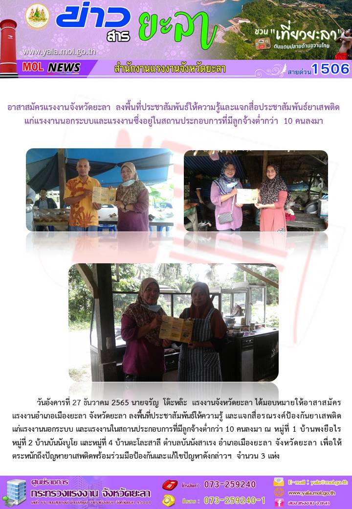 สรจ.ยะลา อสร. ลงพื้นที่ประชาสัมพันธ์ให้ความรู้เเละแจกสื่อประชาสัมพันธ์ยาเสพติดแก่แรงงานนอกระบบเเละแรงงานซึ่งอยู่ในสถานประกอบการที่มีลูกจ้างต่ำกว่า 10 คนลงมา