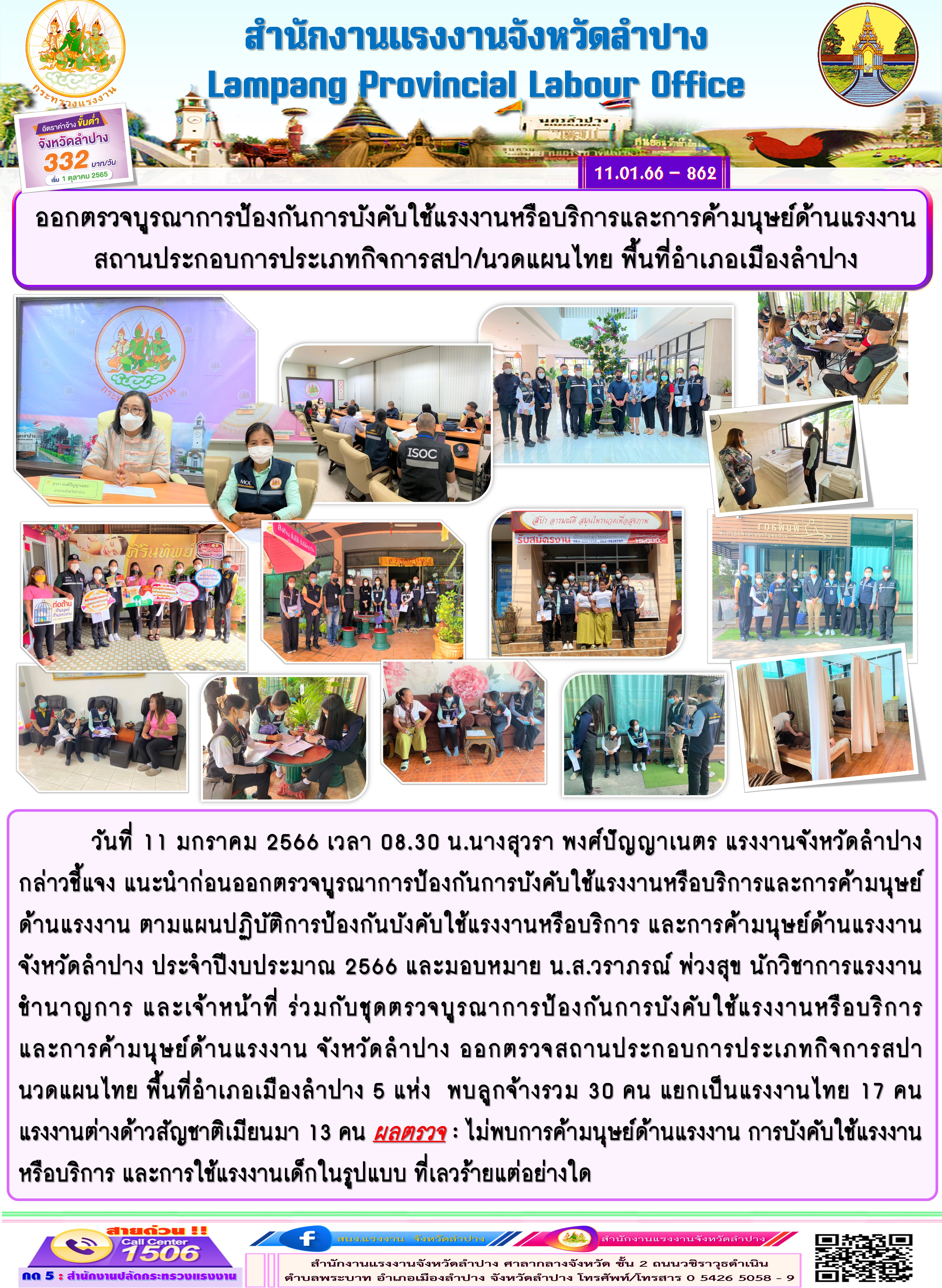 วันที่ 11 มกราคม 2566 เวลา 08.30 น.นางสุวรา พงศ์ปัญญาเนตร แรงงานจังหวัดลำปาง กล่าวชี้แจง แนะนำก่อนออกตรวจบูรณาการป้องกันการบังคับใช้แรงงานหรือบริการและการค้ามนุษย์ ด้านแรงงาน ตามแผนปฏิบัติการป้องกันบังคับใช้แรงงานหรือบริการ และการค้ามนุษย์ด้านแรงงาน จังหวัดลำปาง ประจำปีงบประมาณ 2566 และมอบหมาย น.ส.วราภรณ์ พ่วงสุข นักวิชาการแรงงานชำนาญการ และเจ้าหน้าที่ ร่วมกับชุดตรวจบูรณาการป้องกันการบังคับใช้แรงงานหรือบริการ และการค้ามนุษย์ด้านแรงงาน จังหวัดลำปาง ออกตรวจสถานประกอบการประเภทกิจการสปา นวดแผนไทย พื้นที่อำเภอเมืองลำปาง 5 แห่ง พบลูกจ้างรวม 30 คน แยกเป็นแรงงานไทย 17 คน แรงงานต่างด้าวสัญชาติเมียนมา 13 คน ผลตรวจ : ไม่พบการค้ามนุษย์ด้านแรงงาน การบังคับใช้แรงงาน หรือบริการ และการใช้แรงงานเด็กในรูปแบบ ที่เลวร้ายแต่อย่างใด