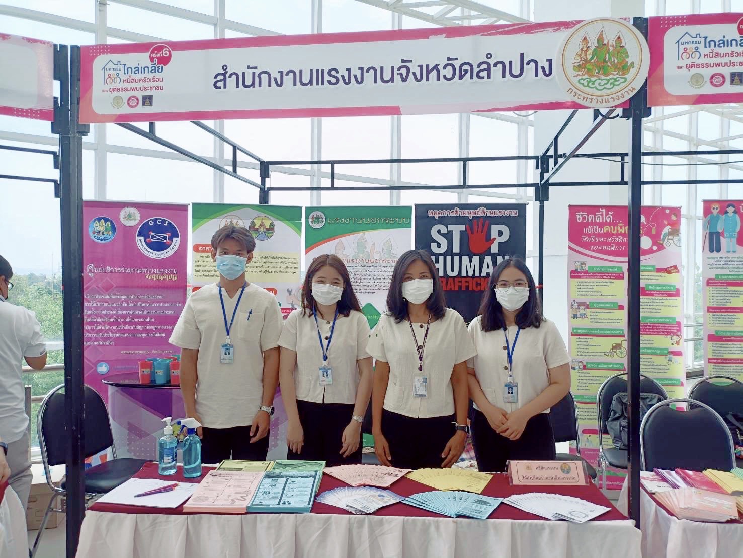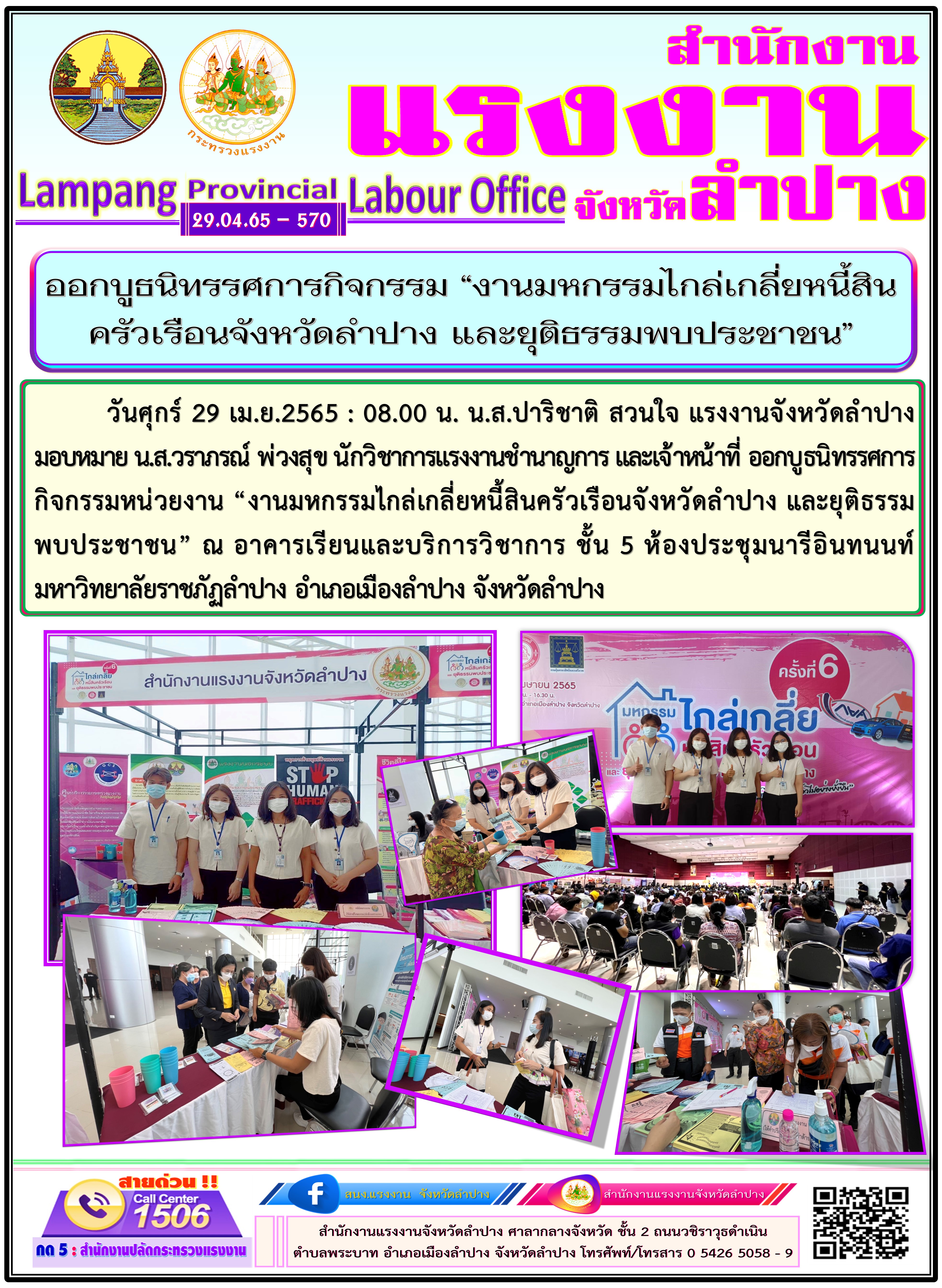 วันศุกร์ 29 เม.ย.2565 : 08.00 น. น.ส.ปาริชาติ สวนใจ แรงงานจังหวัดลำปาง มอบหมาย น.ส.วราภรณ์ พ่วงสุข นักวิชาการแรงงานชำนาญการ และเจ้าหน้าที่ ออกบูธนิทรรศการกิจกรรมหน่วยงาน “งานมหกรรมไกล่เกลี่ยหนี้สินครัวเรือนจังหวัดลำปาง และยุติธรรมพบประชาชน” ณ อาคารเรียนและบริการวิชาการ ชั้น 5 ห้องประชุมนารีอินทนนท์ มหาวิทยาลัยราชภัฏลำปาง อำเภอเมืองลำปาง จังหวัดลำปาง