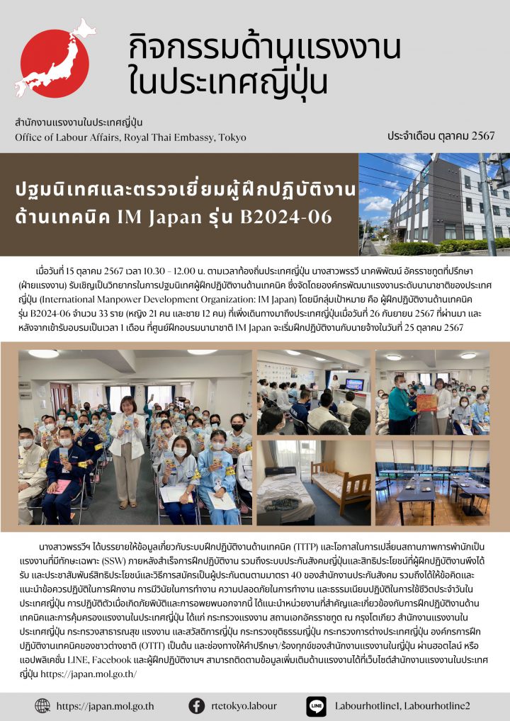 สนร.ญี่ปุ่น อัครราชทูตที่ปรึกษา (ฝ่ายแรงงาน) ปฐมนิเทศและตรวจเยี่ยมให้กำลังใจผู้ฝึกปฏิบัติงานด้านเทคนิค IM Japan รุ่น B2024-06 ณ จังหวัดไซตามะ