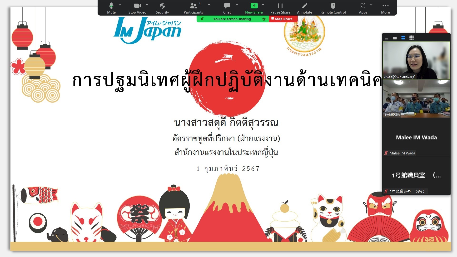 เมื่อวันที่ 1 กุมภาพันธ์ 2567 เวลา 14.00 – 15.00 น. (ตามเวลาท้องถิ่นประเทศญี่ปุ่น ซึ่งเร็วกว่าประเทศไทย 2 ชั่วโมง) นางสาวสดุดี กิตติสุวรรณ อัครราชทูตที่ปรึกษา (ฝ่ายแรงงาน) รับเชิญเป็นวิทยากรในการปฐมนิเทศออนไลน์ ซึ่งจัดโดยองค์กรพัฒนาแรงงานระดับนานาชาติของประเทศญี่ปุ่น (International Manpower Development Organization (IM Japan)) โดยมีกลุ่มเป้าหมาย คือ ผู้ฝึกปฏิบัติงานด้านเทคนิค รุ่น B2023-09 จำนวน 21 ราย ที่เพิ่งเดินทางมาถึงประเทศญี่ปุ่นเมื่อวันที่ 11 มกราคม 2567 ที่ผ่านมา และหลังจากเข้ารับอบรมเป็นเวลา 1 เดือนที่ศูนย์ฝึกอบรมนานาชาติ IM Japan จะเริ่มฝึกงานกับนายจ้างในวันที่ 9 กุมภาพันธ์ 2567
