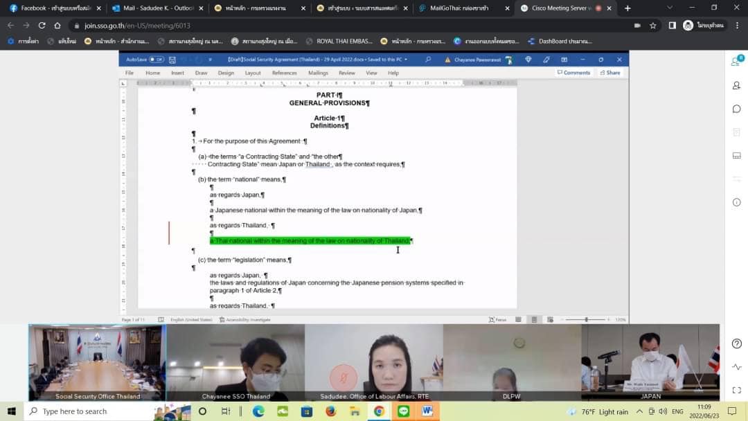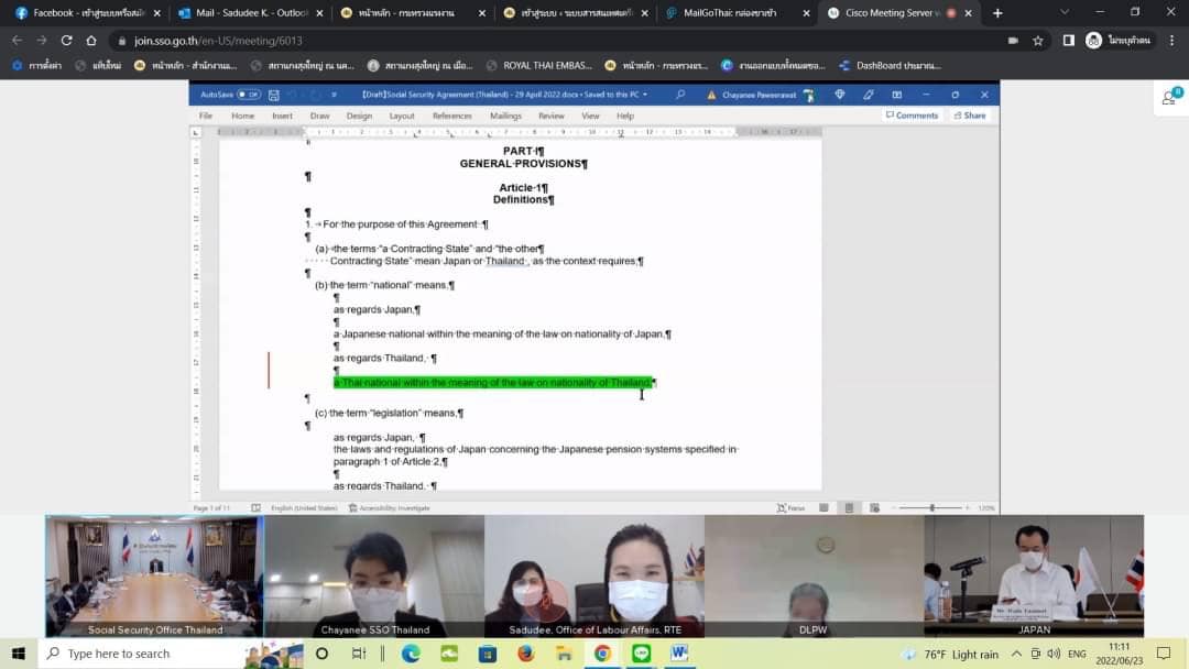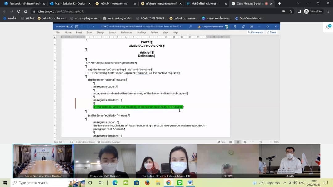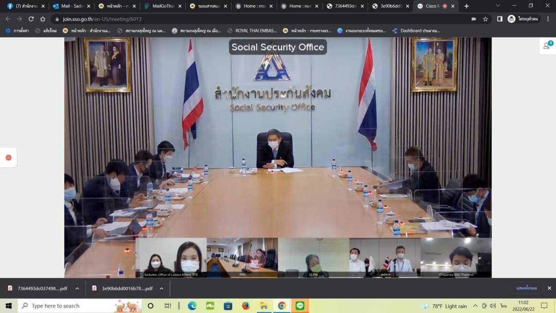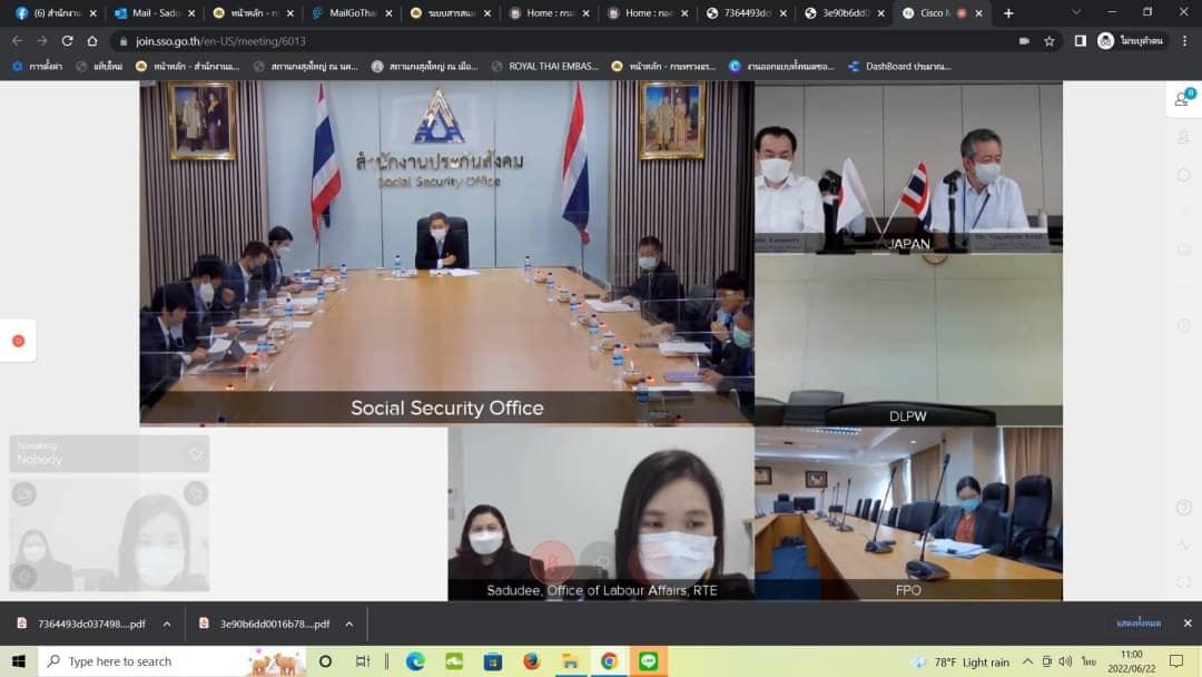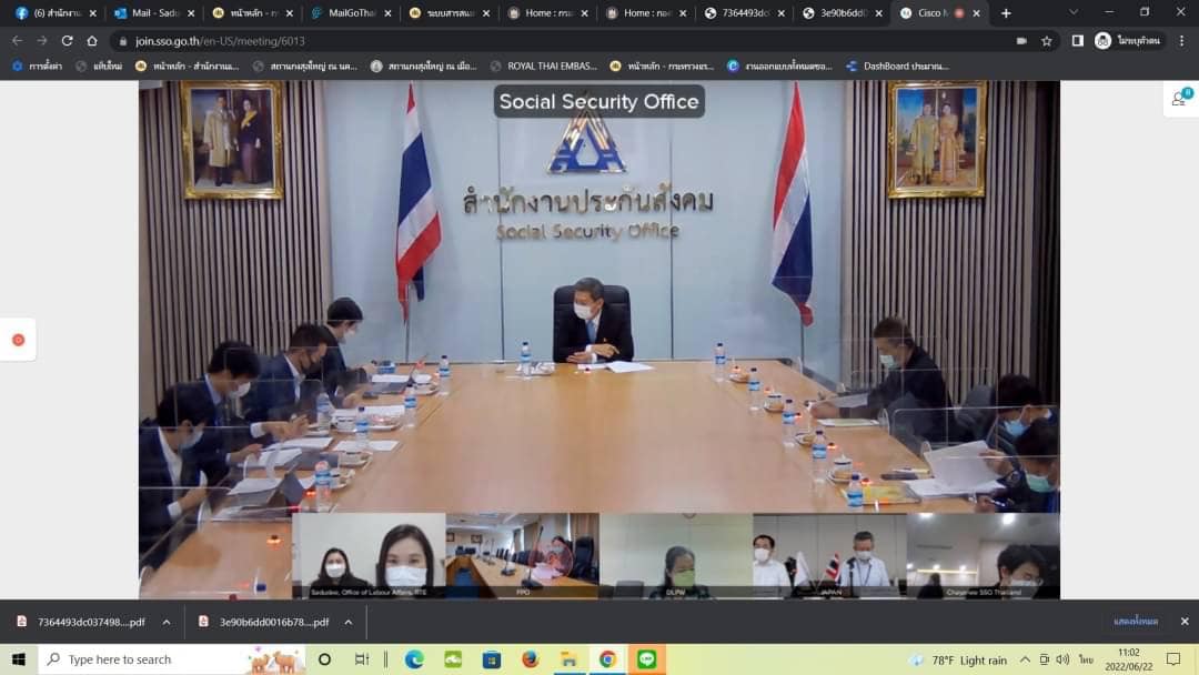 เมื่อวันที่ 22 – 24 มิถุนายน 2565 เวลา 11.00 – 17.00 น. (เวลาท้องถิ่นประเทศญี่ปุ่น ซึ่งเร็วกว่าประเทศไทย 2 ชั่วโมง) นางสาวสดุดี กิตติสุวรรณ อัครราชทูตที่ปรึกษา (ฝ่ายแรงงาน) สำนักงานแรงงานในประเทศญี่ปุ่น พร้อมด้วยนางสาวเกศสุดา มงคลชาติ ที่ปรึกษา (ฝ่ายแรงงาน) เข้าร่วมประชุมหารือออนไลน์เกี่ยวกับความตกลงด้านการประกันสังคมระหว่างประเทศไทยและญี่ปุ่น โดยมีสำนักงานประกันสังคม กระทรวงแรงงาน เป็นเจ้าภาพจัดการประชุมร่วมกับฝ่ายญี่ปุ่น โดยนายศักดินาถ สนธิศักดิ์โยธิน ผู้ตรวจราชการกรม สำนักงานประกันสังคม เป็นประธานฝ่ายไทย และ Mr. Wada Yasuniri ตำแหน่ง Director, International Pension Division, Pension Bureau กระทรวงสาธารณสุข แรงงานและสวัสดิการญี่ปุ่น เป็นประธานฝ่ายญี่ปุ่น ที่ประชุมได้หารือแลกเปลี่ยนข้อมูลด้านการประกันสังคมและได้ร่วมกันพิจารณาร่างความตกลงระหว่างประเทศญี่ปุ่นและราชอาณาจักรไทยว่าด้วยการประกันสังคม (Agreement between Japan and the Kingdom of Thailand on Social Security) โดยทั้งสองฝ่ายจะพิจารณาการจัดทำร่างความตกลงฯ สิทธิประโยชน์กรณีชราภาพเป็นลำดับแรก และจะนำผลจากการประชุมหารือไปพิจารณาปรับร่างความตกลงฯ ให้มีความสมบูรณ์ก่อนจะมีการประชุมอย่างเป็นทางการอีกครั้งในช่วงเดือนมกราคม 2566 โดยมีฝ่ายญี่ปุ่นเป็นเจ้าภาพ