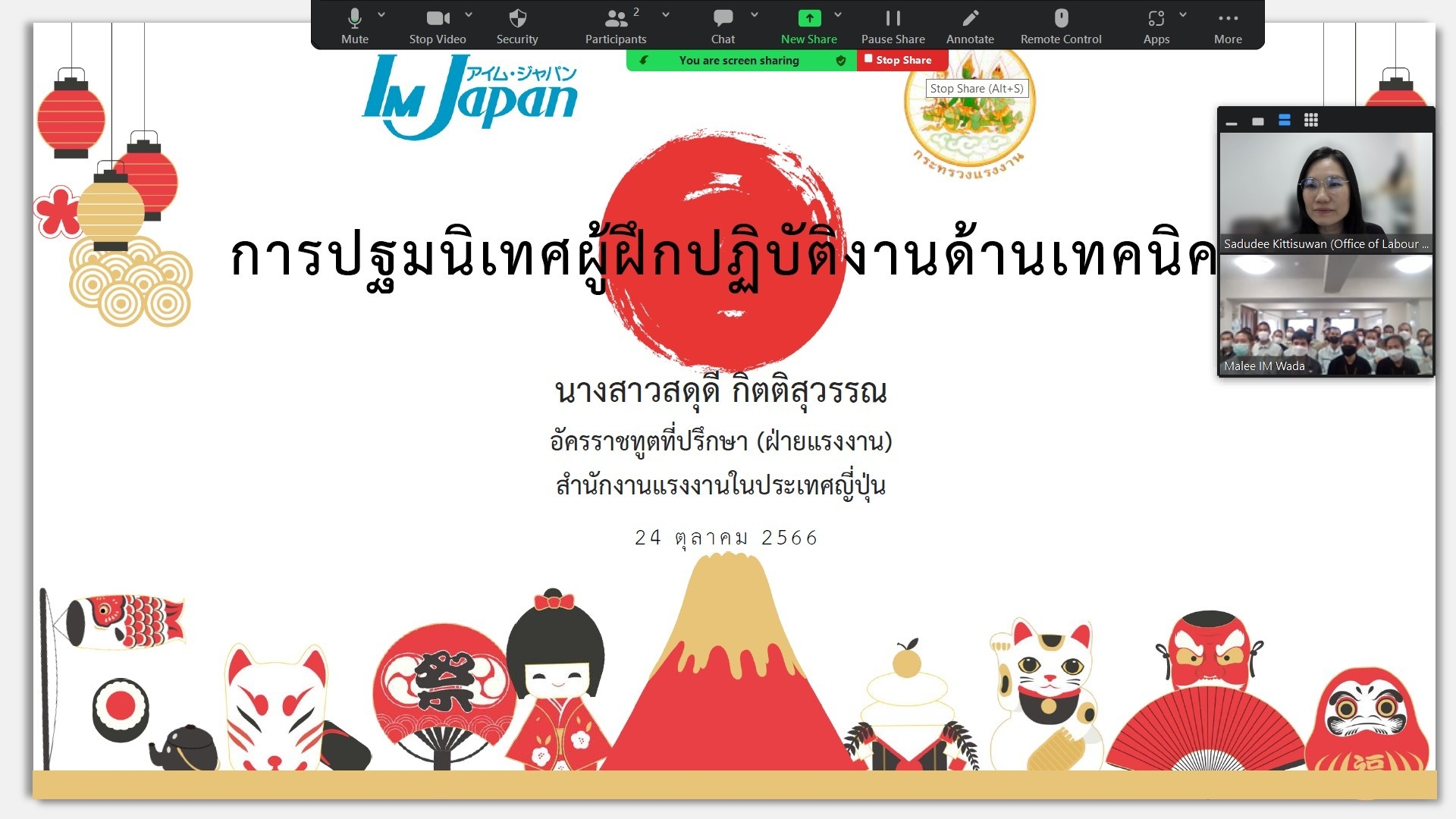 เมื่อวันที่ 24 ตุลาคม 2566 เวลา 14.00 – 15.00 น. (ตามเวลาท้องถิ่นประเทศญี่ปุ่น ซึ่งเร็วกว่าประเทศไทย 2 ชั่วโมง) นางสาวสดุดี กิตติสุวรรณ อัครราชทูตที่ปรึกษา (ฝ่ายแรงงาน) ได้รับเชิญให้เป็นวิทยากรในการปฐมนิเทศออนไลน์ ซึ่งจัดโดยองค์กรพัฒนาแรงงานระดับนานาชาติของประเทศญี่ปุ่น (International Manpower Development Organization (IM Japan)) โดยมีกลุ่มเป้าหมาย คือ ผู้ฝึกปฏิบัติงานด้านเทคนิค รุ่น B2023-06 จำนวน 30 ราย ที่เพิ่งเดินทางมาถึงประเทศญี่ปุ่นเมื่อวันที่ 5 ตุลาคม 2566 ที่ผ่านมา และหลังจากเข้ารับอบรมเป็นเวลา 1 เดือนที่ศูนย์ฝึกอบรมนานาชาติ IM Japan จะเริ่มฝึกงานกับนายจ้างในวันที่ 6 พฤศจิกายน 2566