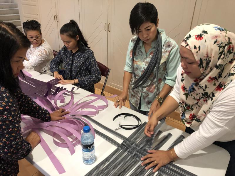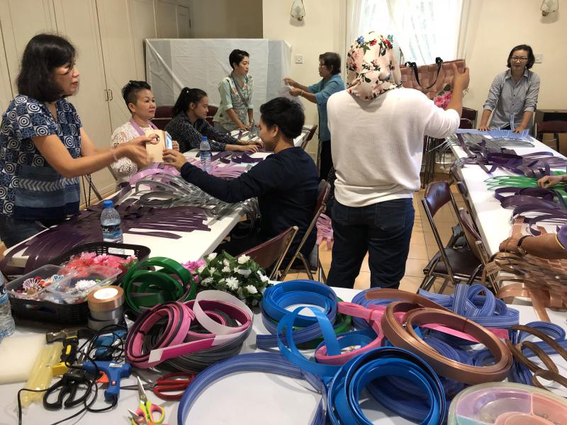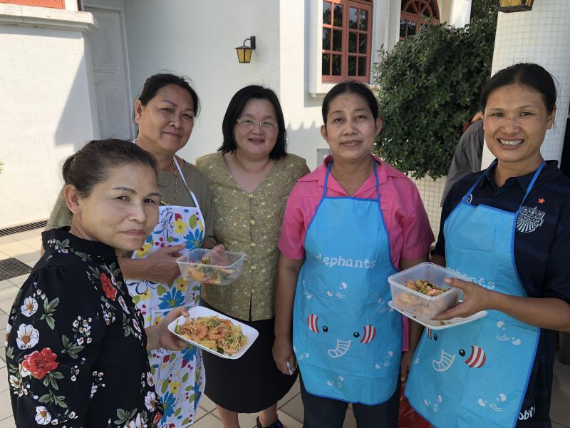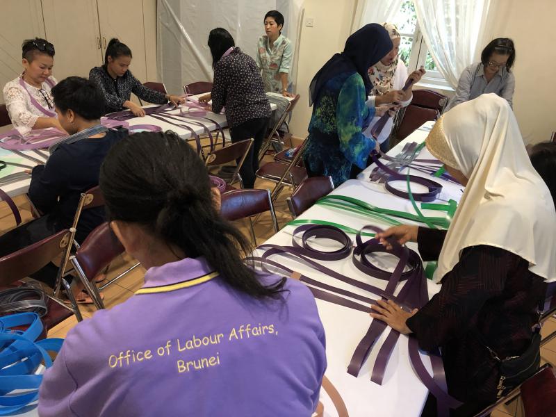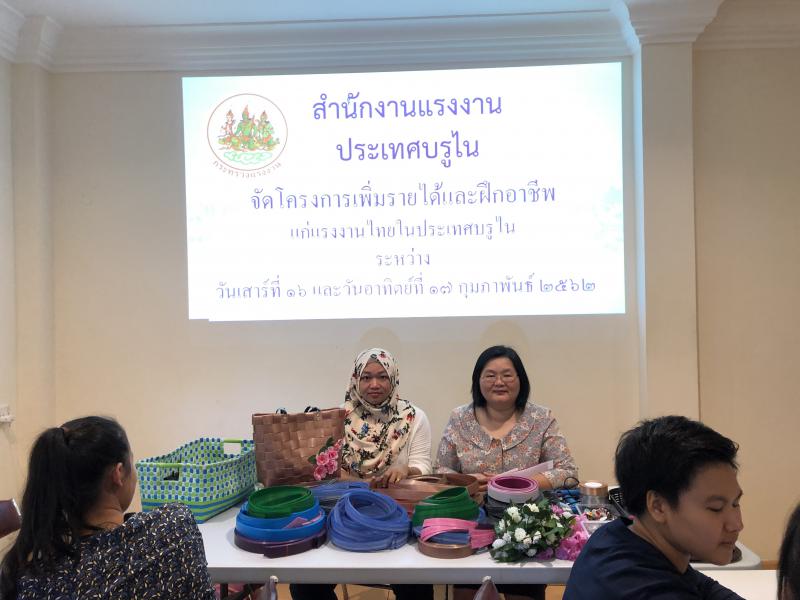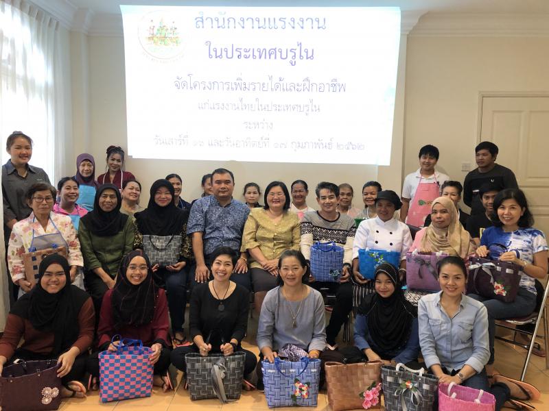 เมื่อวันเสาร์ที่ 16 และวันอาทิตย์ที่ 17 กุมภาพันธ์ 2562 นางนภวรรณ โกละกะ อัครราชทูตที่ปรึกษา (ฝ่ายแรงงาน) สำนักงานแรงงานในประเทศบรูไน พร้อมด้วยเจ้าหน้าที่ สนร.บรูไนได้จัดโครงการฝึกอาชีพเพื่อเพิ่มรายได้แก่แรงงานไทยในบรูไน เพื่อให้แรงงานไทย อาสาสมัครแรงงาน และคนไทยที่พำนักในประเทศบรูไน ได้มีทักษะฝีมือในการผลิตสินค้าและการทำอาหาร ซึ่งจะเป็นช่องทางสร้างรายได้เสริมอีกทางหนึ่ง โดยมีการสาธิตและฝึกทำกระเป๋าสาน การทำบาติกเค้ก ก๋วยเตี๋ยวไก่ โกโลหมี่ และ Butter Prawn ซึ่งแรงงานไทยสามารถใช้เวลาว่างในการผลิตสินค้าหรือประกอบอาหารเหล่านี้เพื่อนำไปจำหน่ายก็จะทำให้มีรายได้เพิ่มขึ้นและสามารถทำเป็นอาชีพเสริมได้อีกทางหนึ่ง โดยมีแรงงานไทยและคนไทยที่พำนักในประเทศบรูไน ให้ความสนใจเข้าร่วมโครงการ จำนวน 40 คน