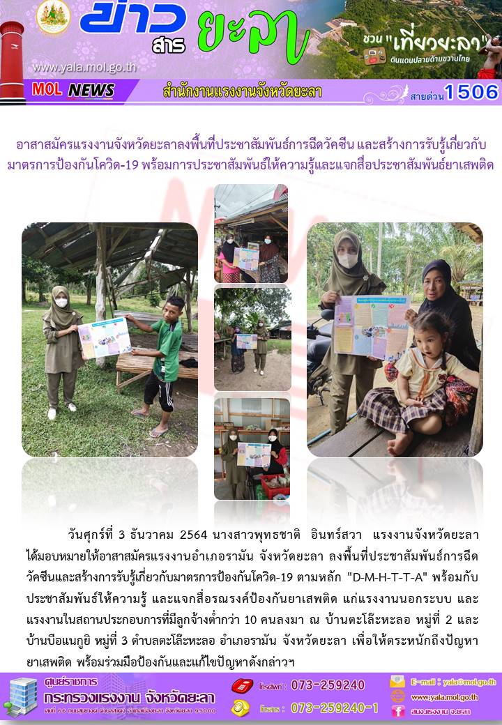 อาสาสมัครแรงงานจังหวัดยะลา ลงพื้นที่ประชาสัมพันธ์การฉีดวัคซีน เเละสร้างการรับรู้เกี่ยวกับมาตรการป้องกันโควิด – 19 (3 ธ.ค. 2564)