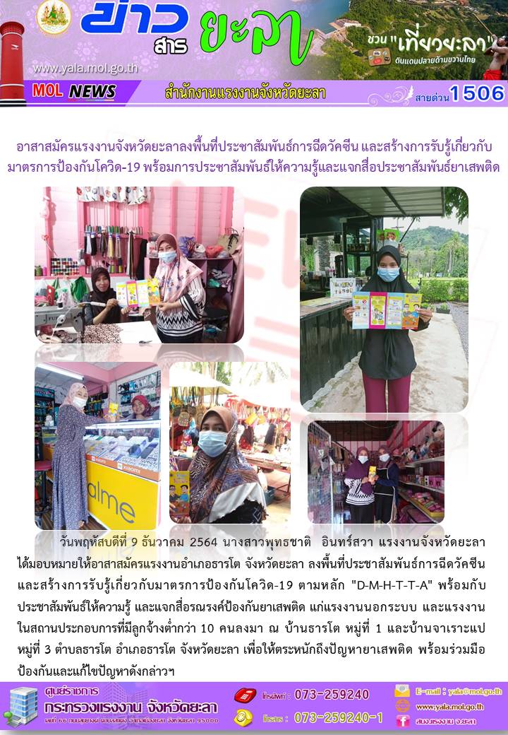 อาสาสมัครแรงงานจังหวัดยะลา ลงพื้นที่ประชาสัมพันธ์การฉีดวัคซีน เเละสร้างการรับรู้เกี่ยวกับมาตรการป้องกันโควิด – 19 (9 ธ.ค. 2564)
