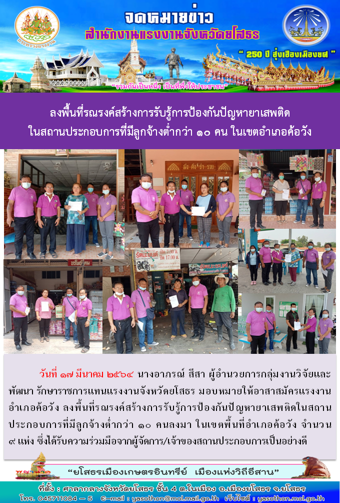 สำนักงานแรงงานจังหวัดยโสธร อาสาสมัครแรงงานอำเภอค้อวัง จังหวัดยโสธร ลงพื้นที่รณรงค์สร้างการรับรู้การป้องกันปัญหายาเสพติด ในสถานประกอบการที่มีลูกจ้างต่ำกว่า 10 คน ในเขตอำเภอค้อวัง