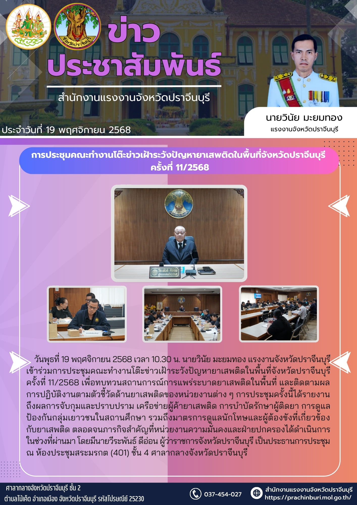 วันพุธที่ 19 พฤศจิกายน 2568 เวลา 10.30 น. นายวินัย มะยมทอง แรงงานจังหวัดปราจีนบุรี เข้าร่วมการประชุมคณะทำงานโต๊ะข่าวเฝ้าระวังปัญหายาเสพติดในพื้นที่จังหวัดปราจีนบุรี ครั้งที่ 11/2568 เพื่อทบทวนสถานการณ์การแพร่ระบาดยาเสพติดในพื้นที่ และติดตามผลการปฏิบัติงานตามตัวชี้วัดด้านยาเสพติดของหน่วยงานต่าง ๆ การประชุมครั้งนี้ได้รายงานถึงผลการจับกุมและปราบปราม เครือข่ายผู้ค้ายาเสพติด การบำบัดรักษาผู้ติดยา การดูแลป้องกันกลุ่มเยาวชนในสถานศึกษา รวมถึงมาตรการดูแลนักโทษและผู้ต้องขังที่เกี่ยวข้องกับยาเสพติด ตลอดจนภารกิจสำคัญที่หน่วยงานความมั่นคงและฝ่ายปกครองได้ดำเนินการในช่วงที่ผ่านมา โดยมีนายวีระพันธ์ ดีอ่อน ผู้ว่าราชการจังหวัดปราจีนบุรี เป็นประธานการประชุม ณ ห้องประชุมสระมรกต (401) ชั้น 4 ศาลากลางจังหวัดปราจีนบุรี