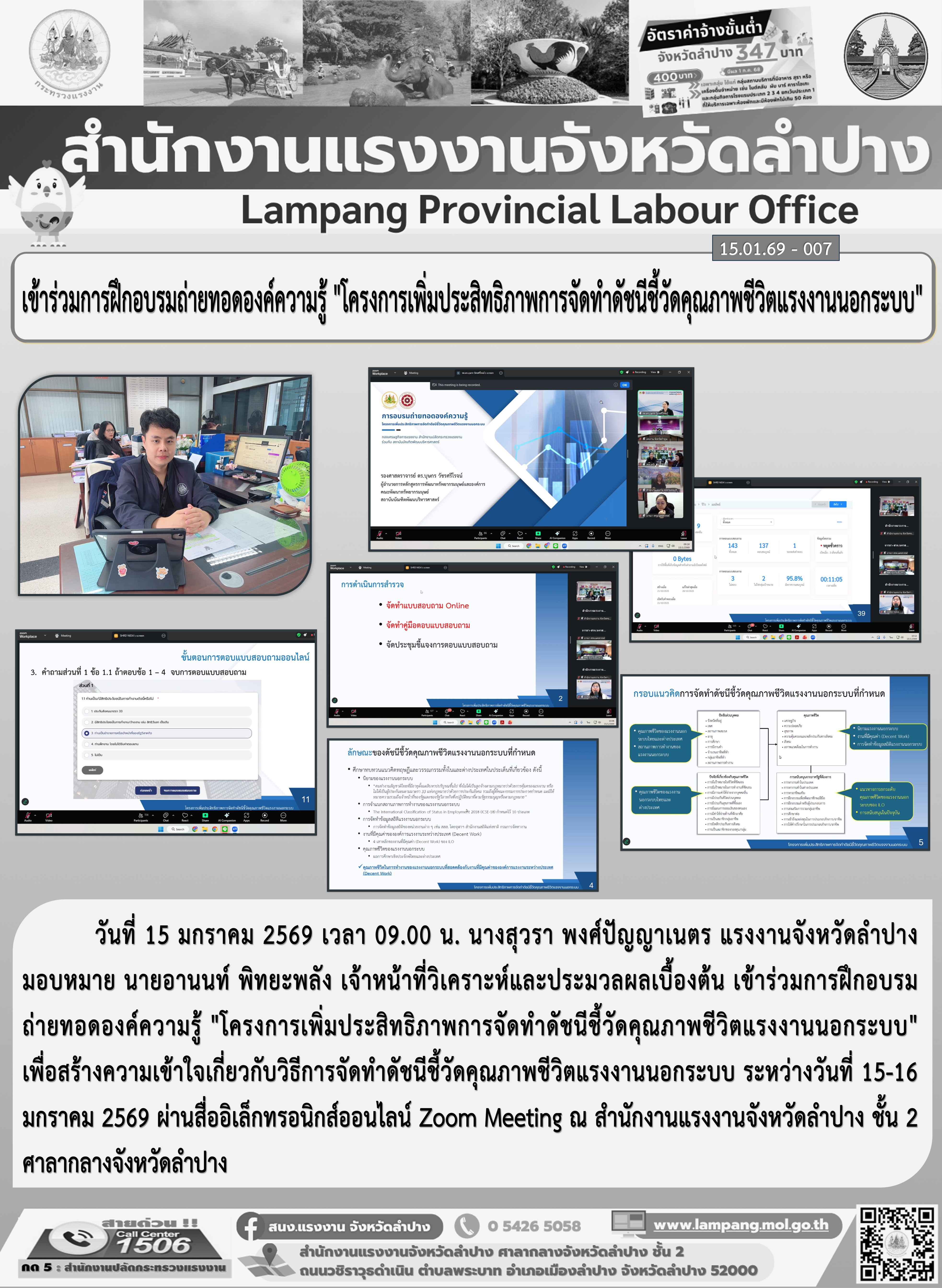 วันที่ 15 มกราคม 2569 เวลา 09.00 น. นางสุวรา พงศ์ปัญญาเนตร แรงงานจังหวัดลำปาง มอบหมาย นายอานนท์ พิทยะพลัง เจ้าหน้าที่วิเคราะห์และประมวลผลเบื้องต้น เข้าร่วมการฝึกอบรมถ่ายทอดองค์ความรู้ “โครงการเพิ่มประสิทธิภาพการจัดทำดัชนีชี้วัดคุณภาพชีวิตแรงงานนอกระบบ” เพื่อสร้างความเข้าใจเกี่ยวกับวิธีการจัดทำดัชนีชี้วัดคุณภาพชีวิตแรงงานนอกระบบ ระหว่างวันที่ 15-16 มกราคม 2569 ผ่านสื่ออิเล็กทรอนิกส์ออนไลน์ Zoom Meeting ณ สำนักงานแรงงานจังหวัดลำปาง ชั้น 2 ศาลากลางจังหวัดลำปาง