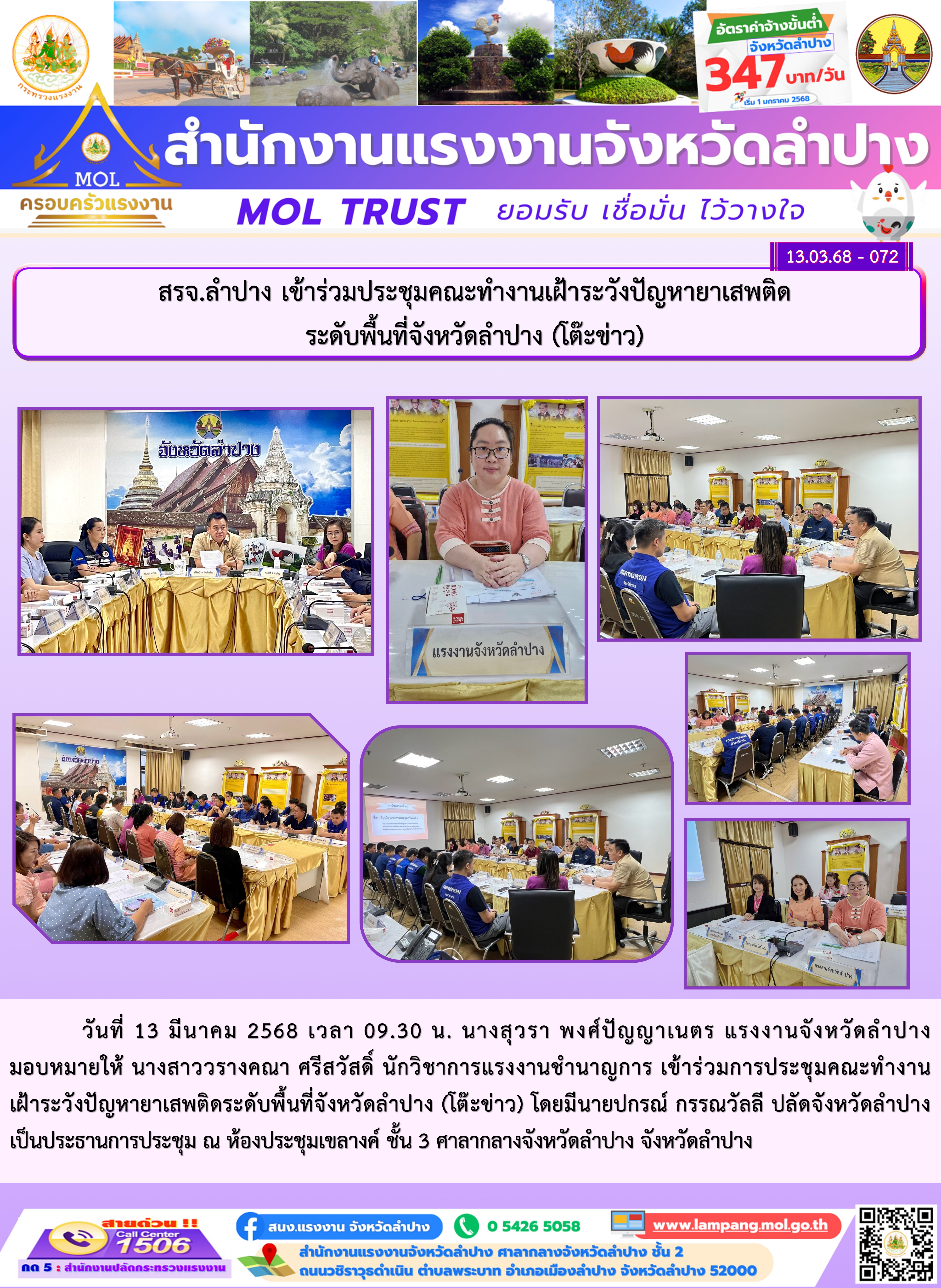 วันที่ 13 มีนาคม 2568 เวลา 09.30 น. นางสุวรา พงศ์ปัญญาเนตร แรงงานจังหวัดลำปาง มอบหมาย นางสาววรางคณา ศรีสวัสดิ์ นักวิชาการแรงงานชำนาญการ เข้าร่วมประชุมคณะทำงานเฝ้าระวังปัญหายาเสพติดระดับพื้นที่จังหวัดลำปาง (โต๊ะข่าว)โดยมีนายปกรณ์ กรรณวัลลี ปลัดจังหวัดลำปาง เป็นประธานการประชุม ณ ห้องประชุมเขลางค์ ชั้น 3 ศาลากลางจังหวัดลำปาง