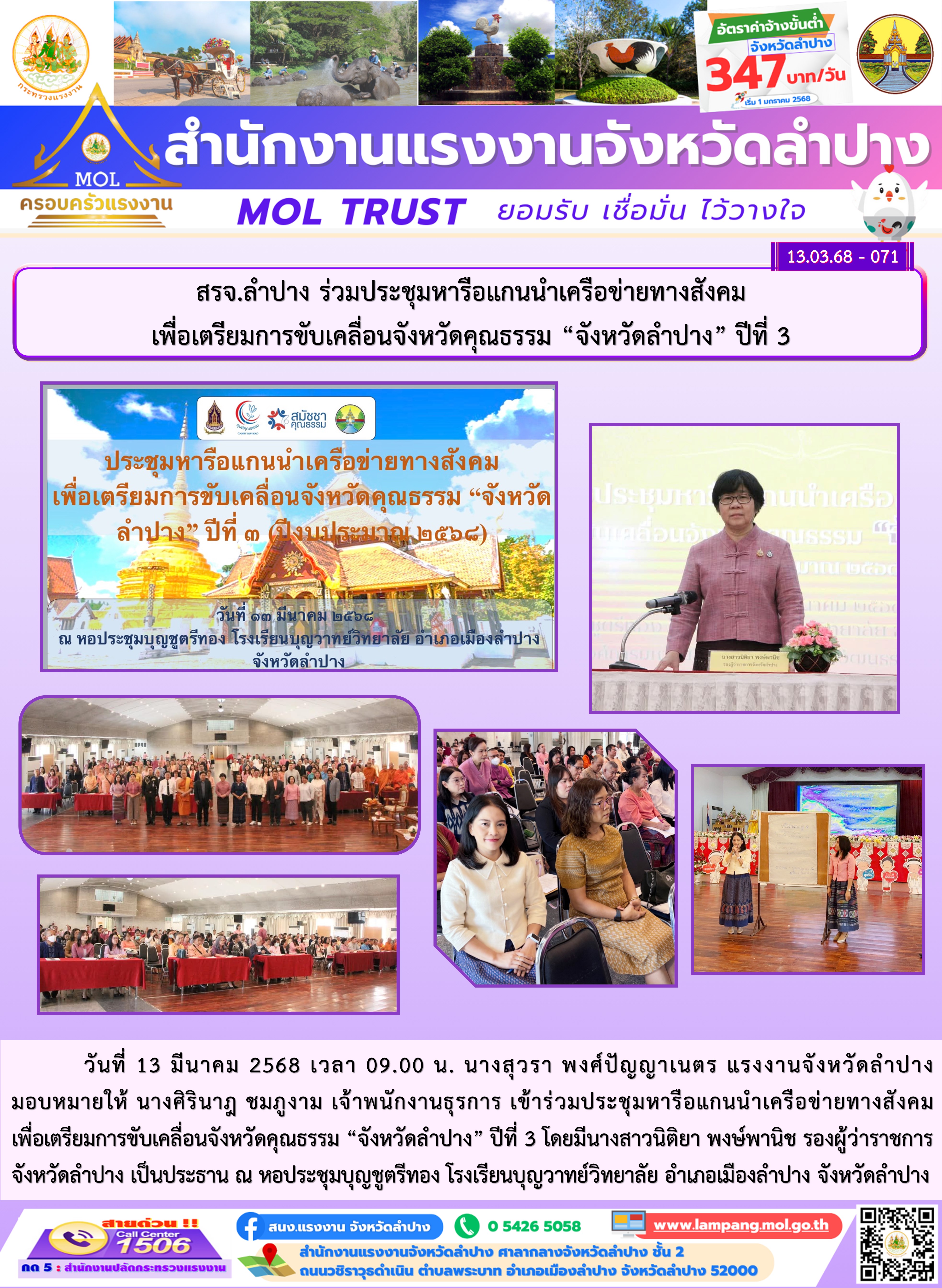 วันที่ 13 มีนาคม 2568 เวลา 09.00 น. นางสุวรา พงศ์ปัญญาเนตร แรงงานจังหวัดลำปาง มอบหมายให้ นางศิรินาฎ ชมภูงาม เจ้าพนักงานธุรการ เข้าร่วมประชุมหารือแกนนำเครือข่ายทางสังคม เพื่อเตรียมการขับเคลื่อนจังหวัดคุณธรรม “จังหวัดลำปาง” ปีที่ 3 โดยมีนางสาวนิติยา พงษ์พานิช รองผู้ว่าราชการจังหวัดลำปาง เป็นประธาน ณ หอประชุมบุญชูตรีทอง โรงเรียนบุญวาทย์วิทยาลัย อำเภอเมืองลำปาง จังหวัดลำปาง