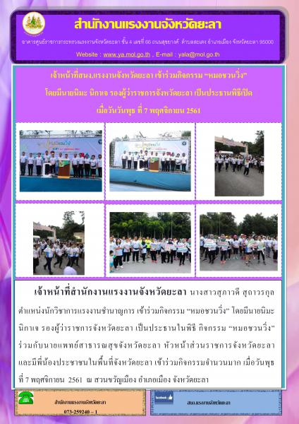 เจ้าหน้าที่สำนักงานแรงงานจังหวัดยะลา นางสาวสุภาวดี สุถาวรกุล ตำแหน่งนักวิชาการแรงงานชำนาญการ เข้าร่วมกิจกรรม “หมอชวนวิ่ง” โดยมีนายนิมะ นิกาเจ รองผู้ว่าราชการจังหวัดยะลา เป็นประธานในพิธี กิจกรรม “หมอชวนวิ่ง” ร่วมกับนายแพทย์สาธารณสุขจังหวัดยะลา หัวหน้าส่วนราชการจังหวัดยะลา และมีพี่น้องประชาชนในพื้นที่จังหวัดยะลา เข้าร่วมกิจกรรมจำนวนมาก เมื่อวันพุธ ที่ 7 พฤศจิกายน 2561 ณ สวนขวัญเมือง อำเภอเมือง จังหวัดยะลา