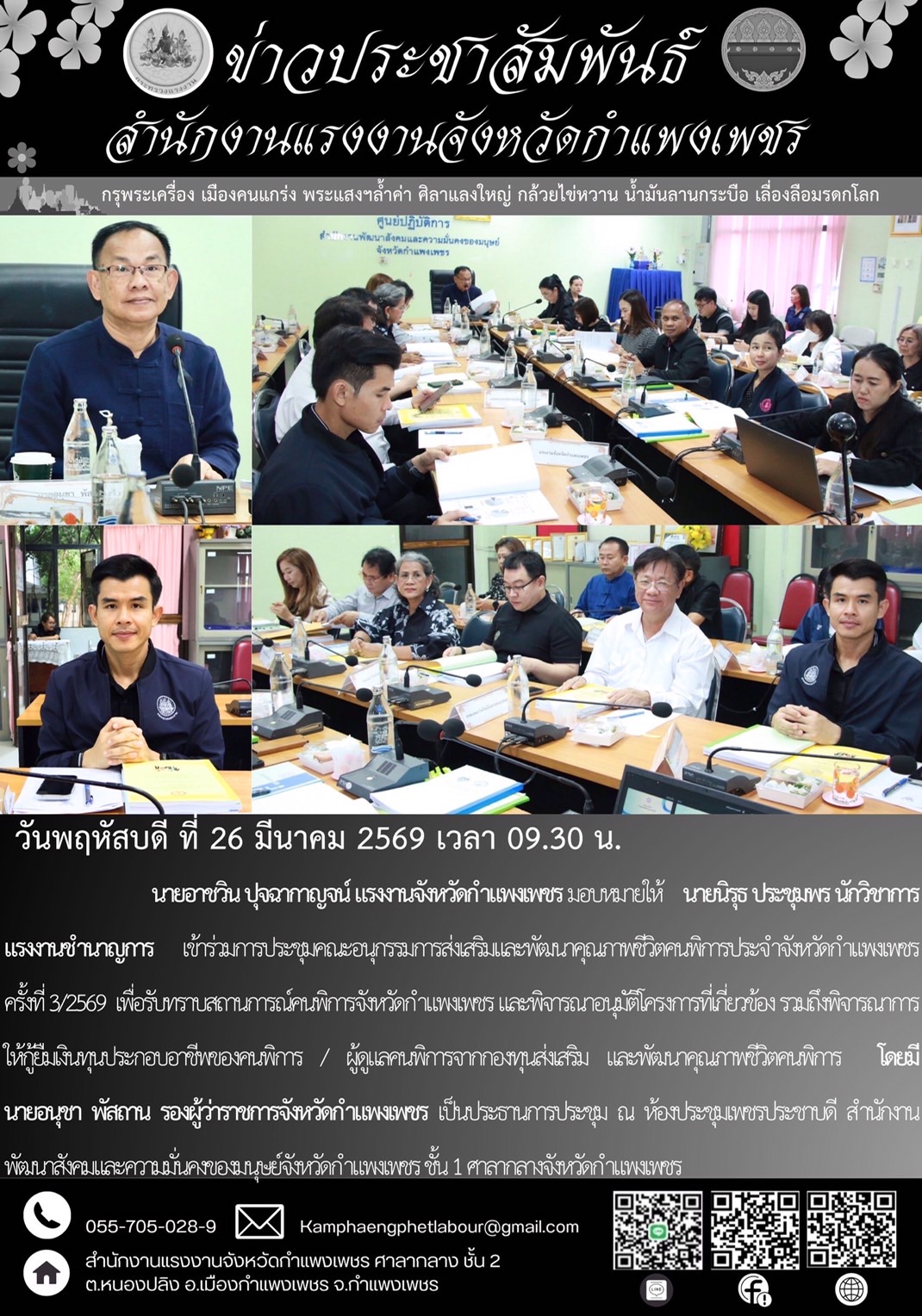 เจ้าหน้าที่สำนักงานแรงงานจังหวัดกำแพงเพชร ร่วมประชุมคณะอนุกรรมการส่งเสริมและพัฒนาคุณภาพชีวิตคนพิการประจำจังหวัดกำแพงเพชร ครั้งที่ 3/2569