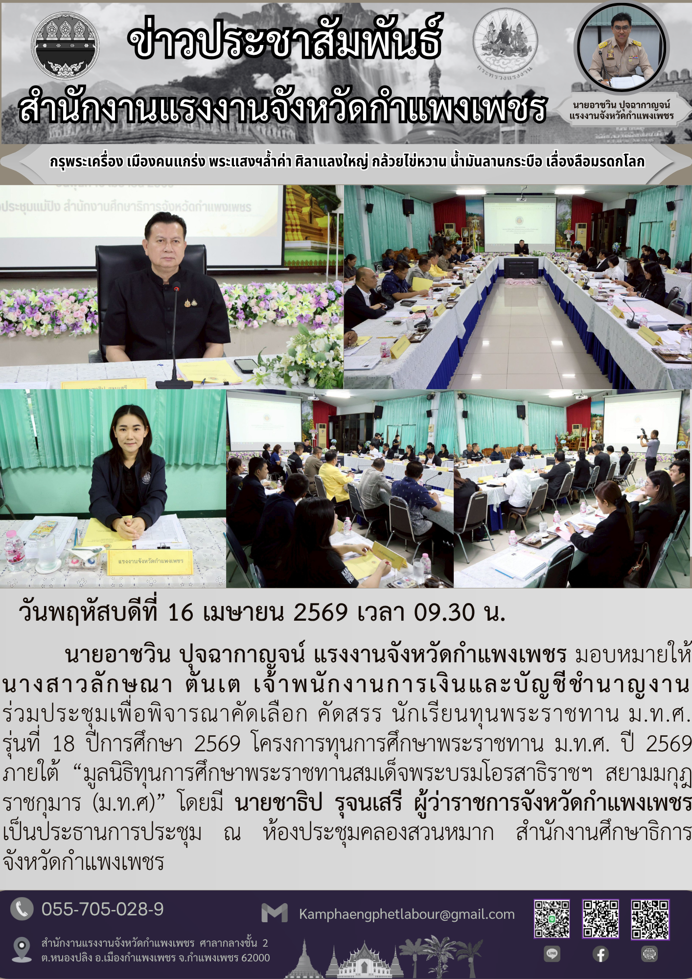เจ้าหน้าที่สำนักงานแรงงานจังหวัดกำแพงเพชร ร่วมประชุมเพื่อพิจารณาคัดเลือก คัดสรร นักเรียนทุนพระราชทาน ม.ท.ศ. รุ่นที่ 18 ปีการศึกษา 2569