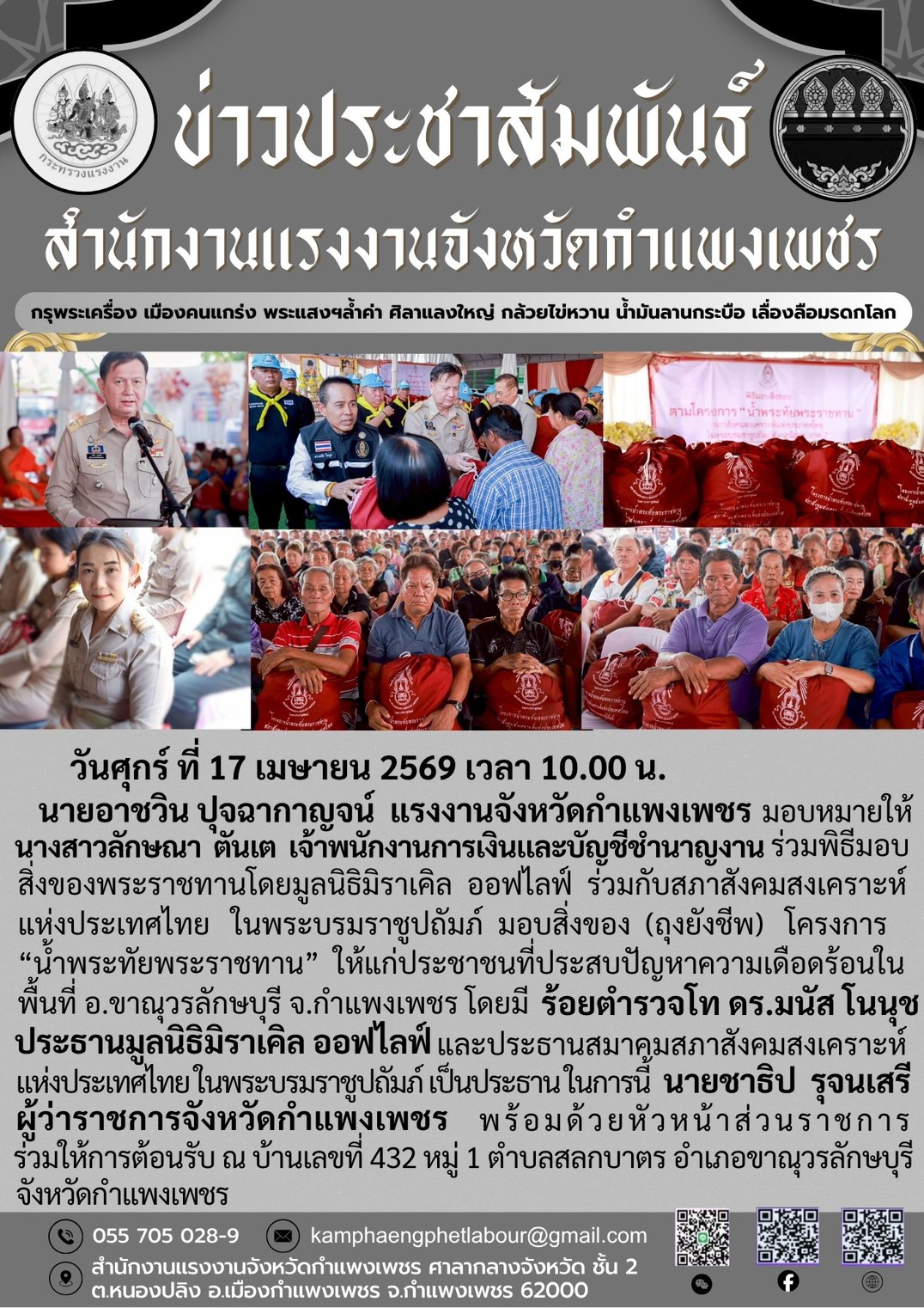 เจ้าหน้าที่สำนักงานแรงงานจังหวัดกำแพงเพชร ร่วมพิธีมอบสิ่งของตามโครงการ น้ำพระทัยพระราชทาน (ถุงยังชีพ)