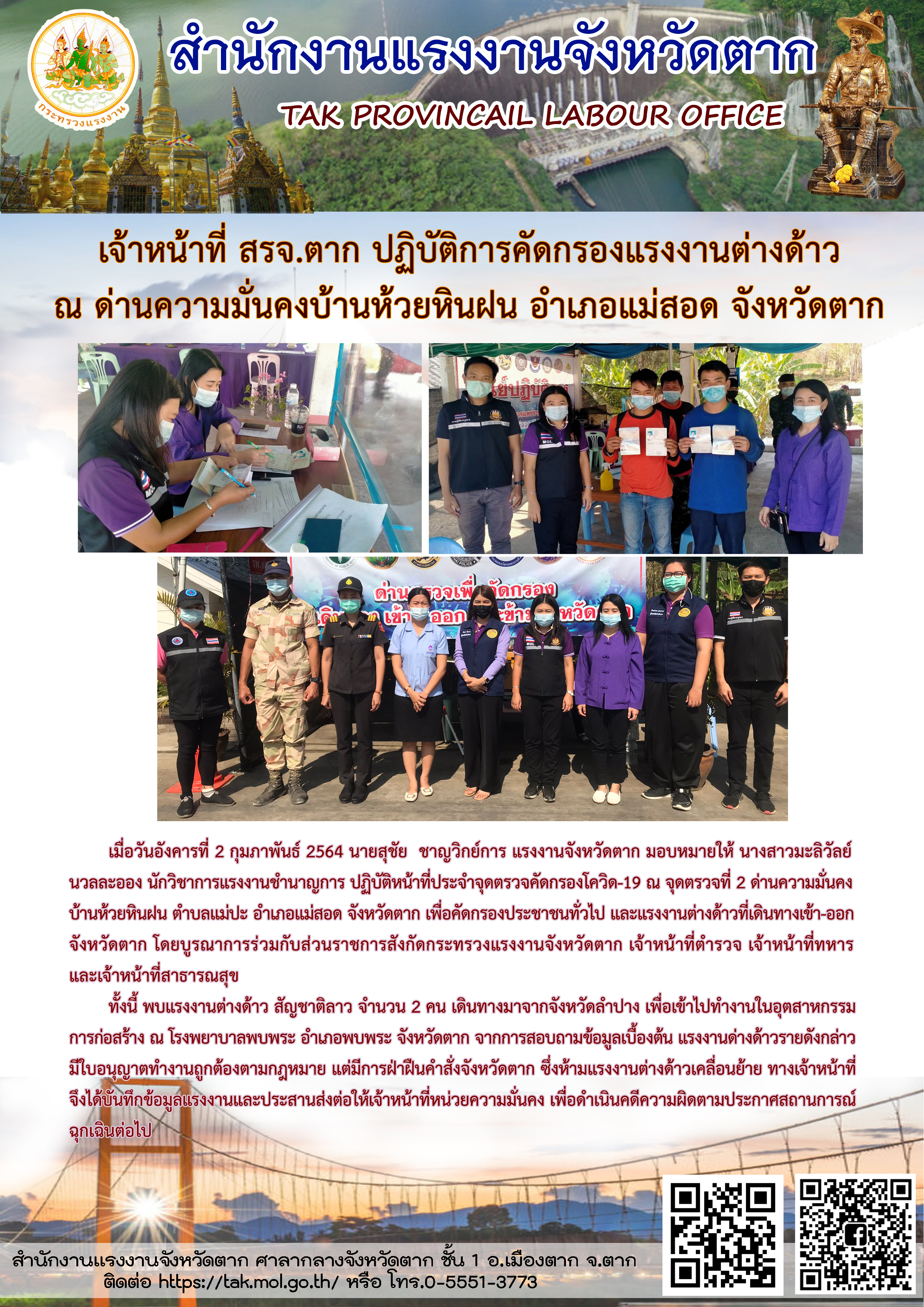 เจ้าหน้าที่ สรจ.ตาก ปฏิบัติการคัดกรองแรงงานต่างด้าว ณ ด่านความมั่นคงบ้านห้วยหินฝน อำเภอแม่สอด จังหวัดตาก