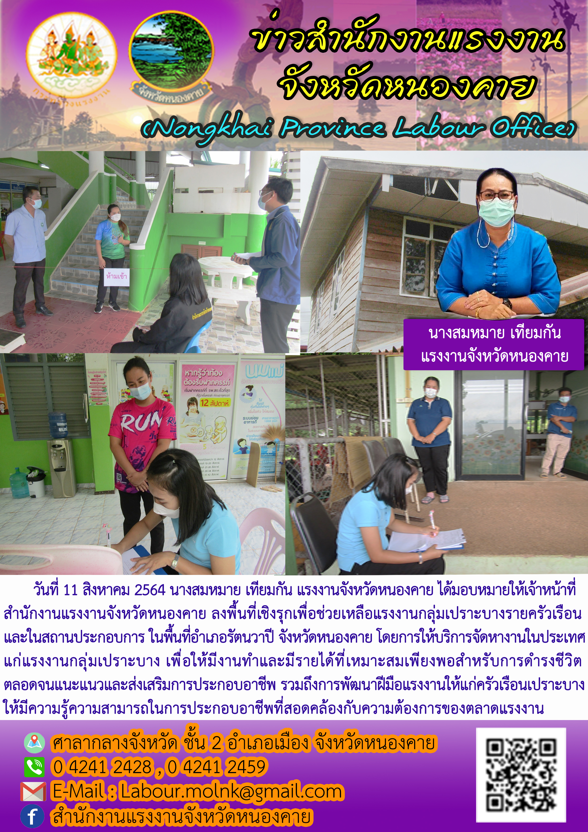 วันที่ 11 สิงหาคม 2564 นางสมหมาย เทียมกัน แรงงานจังหวัดหนองคาย ได้มอบหมายให้เจ้าหน้าที่สำนักงานแรงงานจังหวัดหนองคาย ลงพื้นที่เชิงรุกเพื่อช่วยเหลือแรงงานกลุ่มเปราะบางรายครัวเรือนและในสถานประกอบการ ในพื้นที่อำเภอรัตนวาปี จังหวัดหนองคาย โดยการให้บริการจัดหางานในประเทศแก่แรงงานกลุ่มเปราะบาง เพื่อให้มีงานทำและมีรายได้ที่เหมาะสมเพียงพอสำหรับการดำรงชีวิต ตลอดจนแนะแนวและส่งเสริมการประกอบอาชีพ รวมถึงการพัฒนาฝีมือแรงงานให้แก่ครัวเรือนเปราะบาง ให้มีความรู้ความสามารถในการประกอบอาชีพที่สอดคล้องกับความต้องการของตลาดแรงงาน