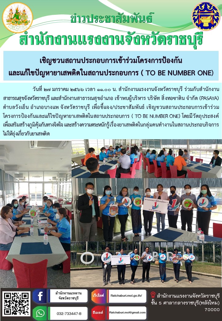 สรจ.ราชบุรี เชิญชวนสถานประกอบการเข้าร่วมโครงการป้องกันและแก้ไขปัญหายาเสพติดในสถานประกอบการ ( TO BE NUMBER ONE)