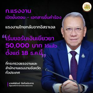 เช็คที่นี่!! รมว.แรงงาน “พิพัฒน์” เปิดขั้นตอน – เอกสาร แรงงานไทยกลับจากอิสราเอล ยื่นคำร้องขอรับเงินเยียวยา 50,000 บาท ได้แล้วตั้งแต่ 18 ธ.ค.นี้ ที่กระทรวงแรงงานและสำนักงานแรงงานจังหวัดทั่วประเทศ/Check Here! Labour Minister Reveals Process and Documents Required for Thai Workers Returning from Israel in Applying for 50,000 Baht Compensation Starting December 18 at the Ministry of Labour and Provincial Labour Offices Nationwide