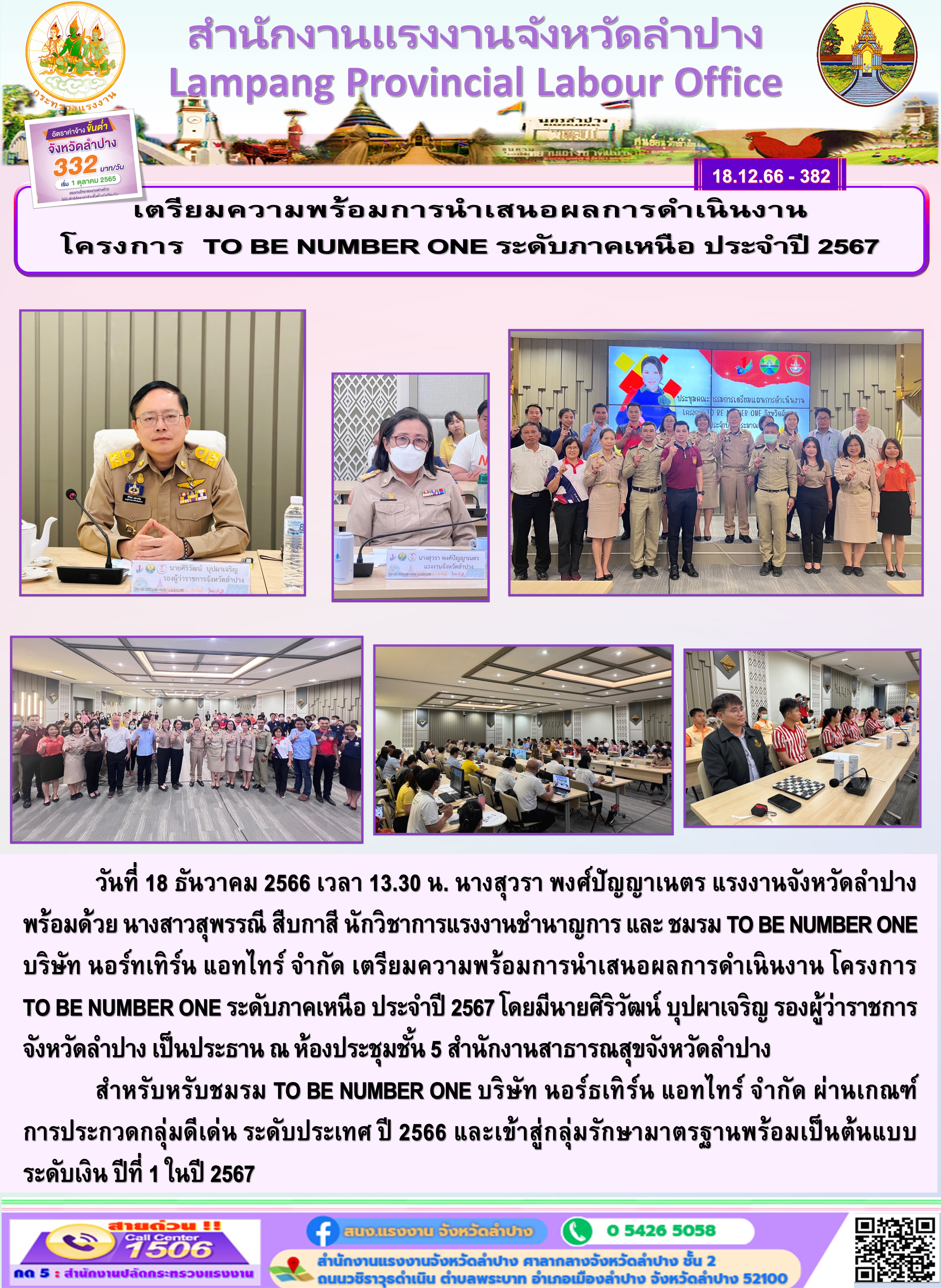 วันที่ 18 ธันวาคม 2566 เวลา 13.30 น. นางสุวรา พงศ์ปัญญาเนตร แรงงานจังหวัดลำปาง พร้อมด้วย นางสาวสุพรรณี สืบกาสี นักวิชาการแรงงานชำนาญการ และ ชมรม TO BE NUMBER ONE บริษัท นอร์ทเทิร์น แอทไทร์ จำกัด เตรียมความพร้อมการนำเสนอผลการดำเนินงาน โครงการ TO BE NUMBER ONE ระดับภาคเหนือ ประจำปี 2567 โดยมีนายศิริวัฒน์ บุปผาเจริญ รองผู้ว่าราชการจังหวัดลำปาง เป็นประธาน ณ ห้องประชุมชั้น 5 สำนักงานสาธารณสุขจังหวัดลำปาง สำหรับหรับชมรม TO BE NUMBER ONE บริษัท นอร์ธเทิร์น แอทไทร์ จำกัด ผ่านเกณฑ์ การประกวดกลุ่มดีเด่น ระดับประเทศ ปี 2566 และเข้าสู่กลุ่มรักษามาตรฐานพร้อมเป็นต้นแบบ ระดับเงิน ปีที่ 1 ในปี 2567