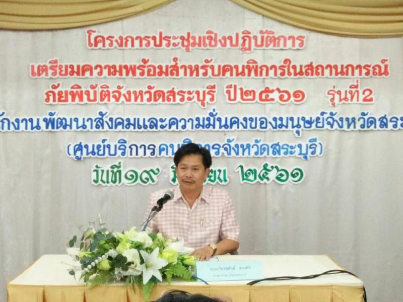 วันที่ 19 มิถุนายน 2561 เวลา 09.00 น. นางสาวรัตนา ทองกลับ แรงงานจังหวัดสระบุรี พร้อมด้วยหัวหน้าส่วนราชการสังกัดกระทรวงแรงงาน ร่วมเป็นเกียรติพิธีเปิดโครงการประชุมเชิงปฏิบัติการเตรียมความพร้อมสำหรับคนพิการในสถานการณ์ภัยพิบัติจังหวัดสระบุรี ปี 2561 รุ่นที่ 2 ซึ่งจัดโดยสำนักงานพัฒนาสังคมและความมั่นคงของมนุษย์จังหวัดสระบุรี ณ โรงแรมสระบุรีอินน์ อ.เมือง จ.สระบุรี โดยมีนายเกียรติศักดิ์ ตรงศิริ รองผู้ว่าราชการจังหวัดสระบุรี เป็นประธาน