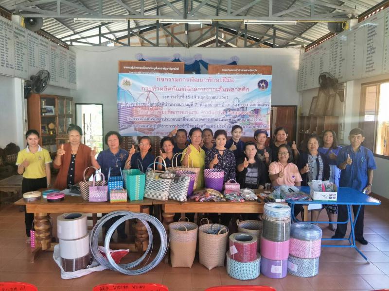 วันที่ 15 พฤศจิกายน 2561 นางสาวปราณี ชลารักษ์ แรงงานจังหวัดแพร่ มอบหมายให้ข้าราชการและเจ้าหน้าที่สำนักงานแรงงานจังหวัดแพร่ ลงพื้นที่ทำพิธีเปิดโครงการเพิ่มผลิตภาพแรงงาน Productive Manpower กิจกรรม ส่งเสริมการประกอบอาชีพนอกภาคการเกษตร เพื่อเพิ่มผลิตภาพแรงงาน โครงการตามแผนปฏิบัติราชการจังหวัดแพร่ ประจำปีงบประมาณ 2562 ณ ศาลาประชารัฐสามัคคี บ้านหางนา ม.7 ต.น้ำเลา อ.ร้องกวาง จ.แพร่ (กิจกรรมการพัฒนาทักษะฝีมือการทำเครื่องจักสานจากเส้นพลาสติก)