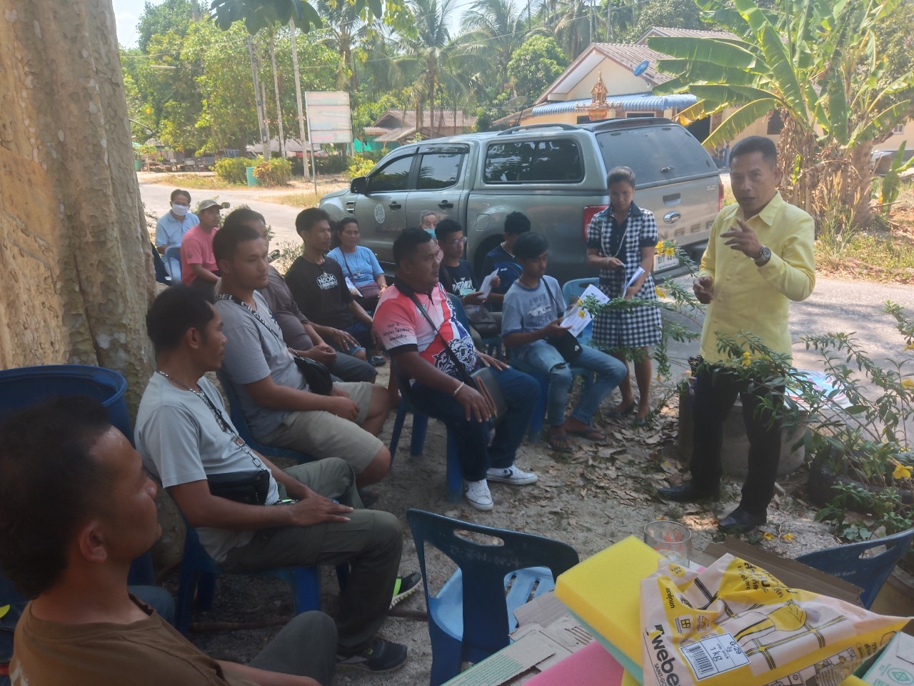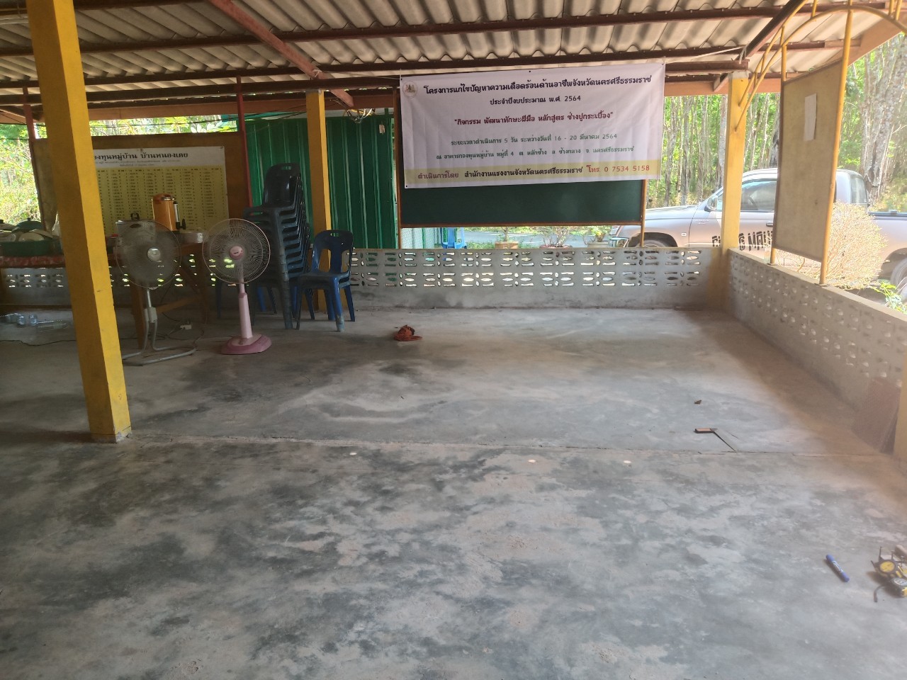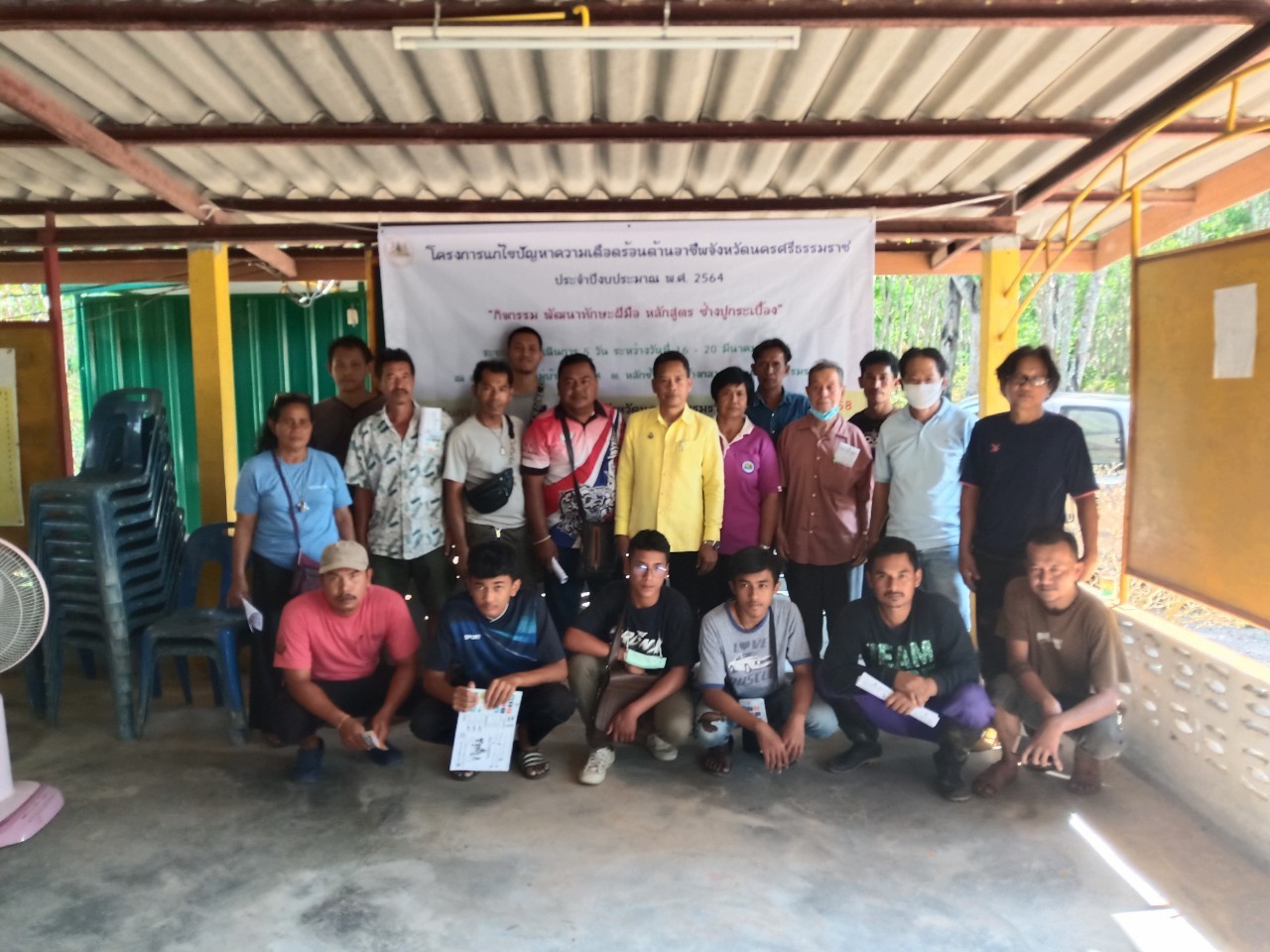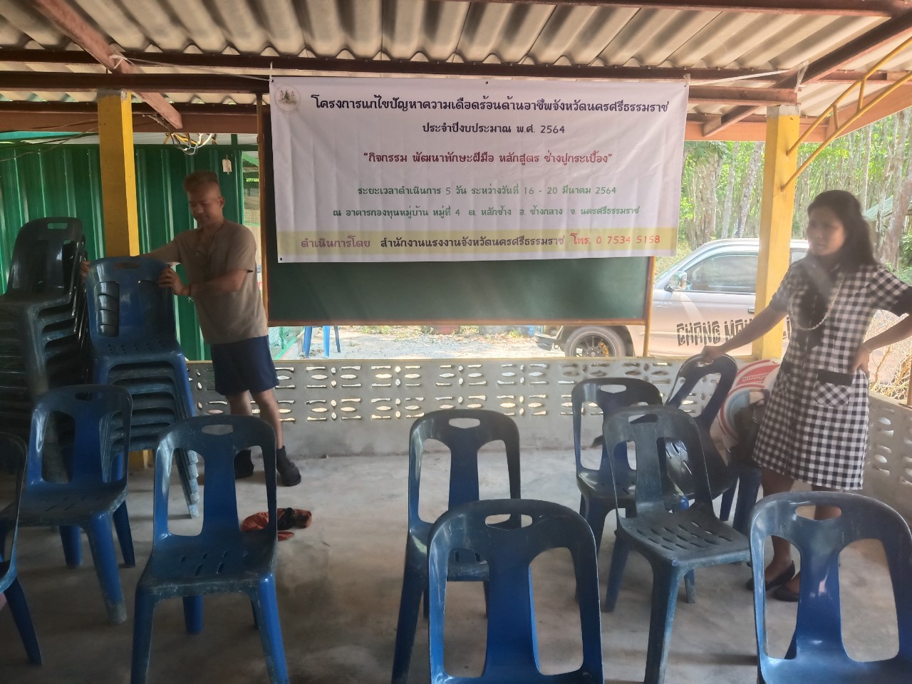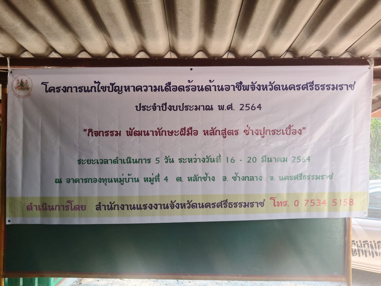 วันที่ 16 มีนาคม 2564 นายบุญลอย เขียดนิล แรงงานจังหวัดนครศรีธรรมราช และนางจิราภรณ์ ศรีหะรัญ เจ้าพนักงานการเงินและบัญชีชำนาญงาน เปิดโครงการแก้ไขปัญหาความเดือดร้อนด้านอาชีพ จังหวัดนครศรีธรรมราช ประจำปีงบประมาณ พ.ศ.2564 กิจกรรมพัฒนาทักษะฝืมือแรงงาน ช่างปูกระเบื้อง ดำเนินการระหว่างวันที่ 16 – 20 มีนาคม 2564 ณ หมู่ที่ 4 ต.หลักช้าง อ.ช้างกลาง จ.นครศรีธรรมราช