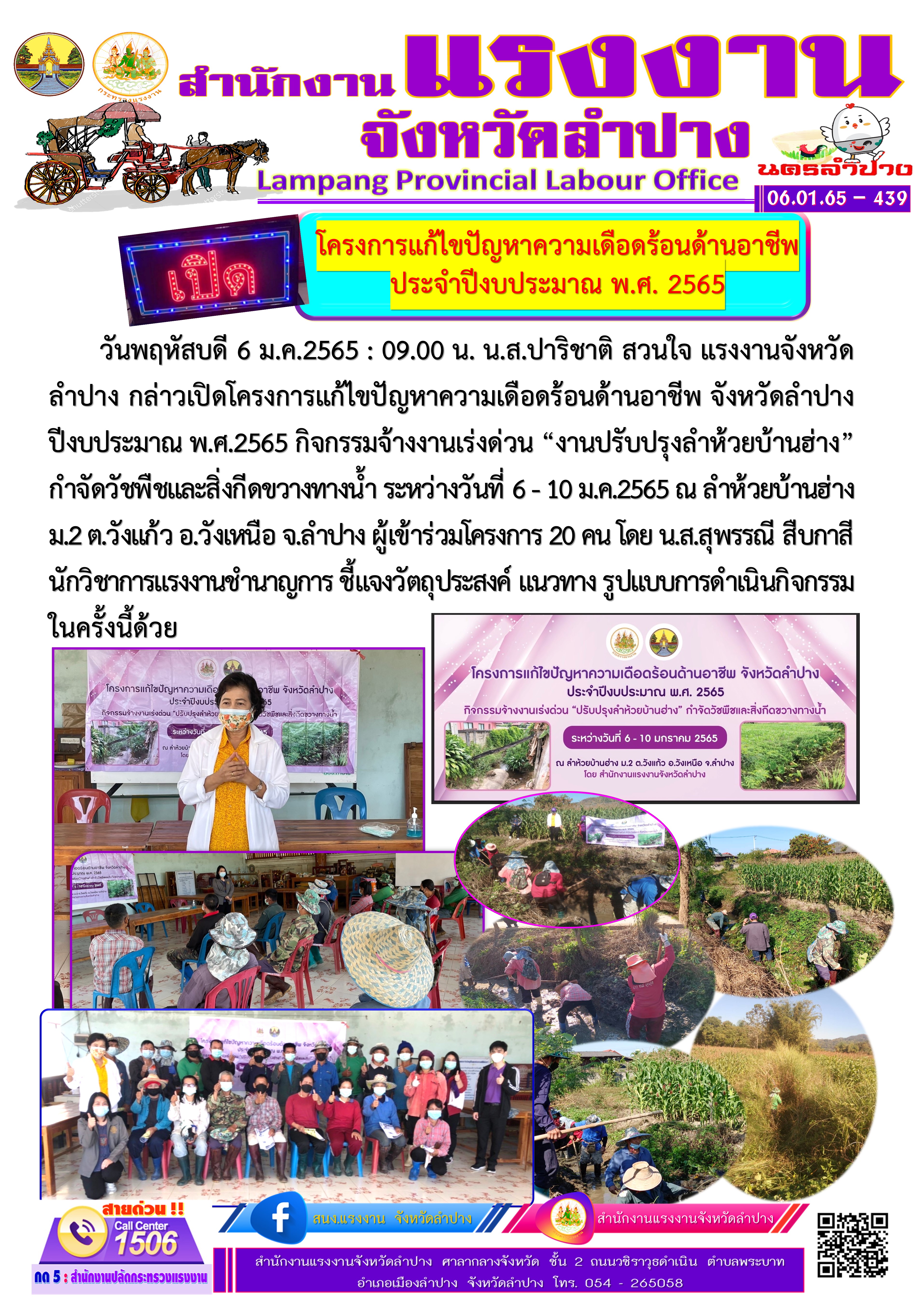 เปิดโครงการแก้ไขปัญหาความเดือดร้อนด้านอาชีพ ประจำปีงบประมาณ พ.ศ. 2565 กิจกรรมจ้างงานเร่งด่วน “งานปรับปรุงลำห้วยบ้านฮ่าง”