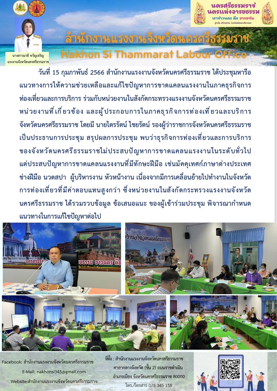 สรุปผลการประชุม พบว่าธุรกิจการท่องเที่ยวและการบริการของจังหวัดนครศรีธรรมราชไม่ประสบปัญหาการขาดแคลนแรงงานในระดับทั่วไป แต่ประสบปัญหาการขาดแคลนแรงงานที่มีทักษะฝีมือ เช่นมัคคุเทศก์ภาษาต่างประเทศ ช่างฝีมือ นวดสปา ผู้บริหารงาน หัวหน้างาน เนื่องจากมีการเคลื่อนย้ายไปทำงานในจังหวัดการท่องเที่ยวที่มีค่าตอบแทนสูงกว่า ซึ่งหน่วยงานในสังกัดกระทรวงแรงงานจังหวัดนครศรีธรรมราช ได้รวมรวบข้อมูล ข้อเสนอแนะ ของผู้เข้าร่วมประชุม พิจารณากำหนดแนวทางในการแก้ไขปัญหาต่อไป