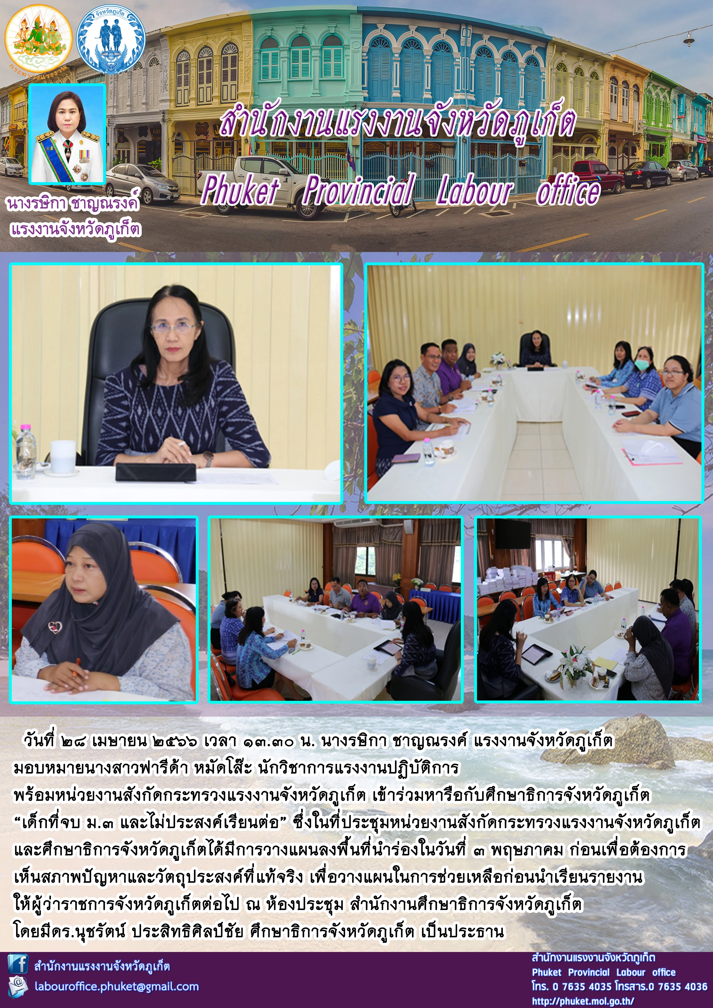 สรจ.ภูเก็ต พร้อมหน่วยงานสังกัดกระทรวงแรงงานจังหวัดภูเก็ต เข้าร่วมหารือกับศึกษาธิการจังหวัดภูเก็ต “เด็กที่จบ ม.3 และไม่ประสงค์เรียนต่อ”