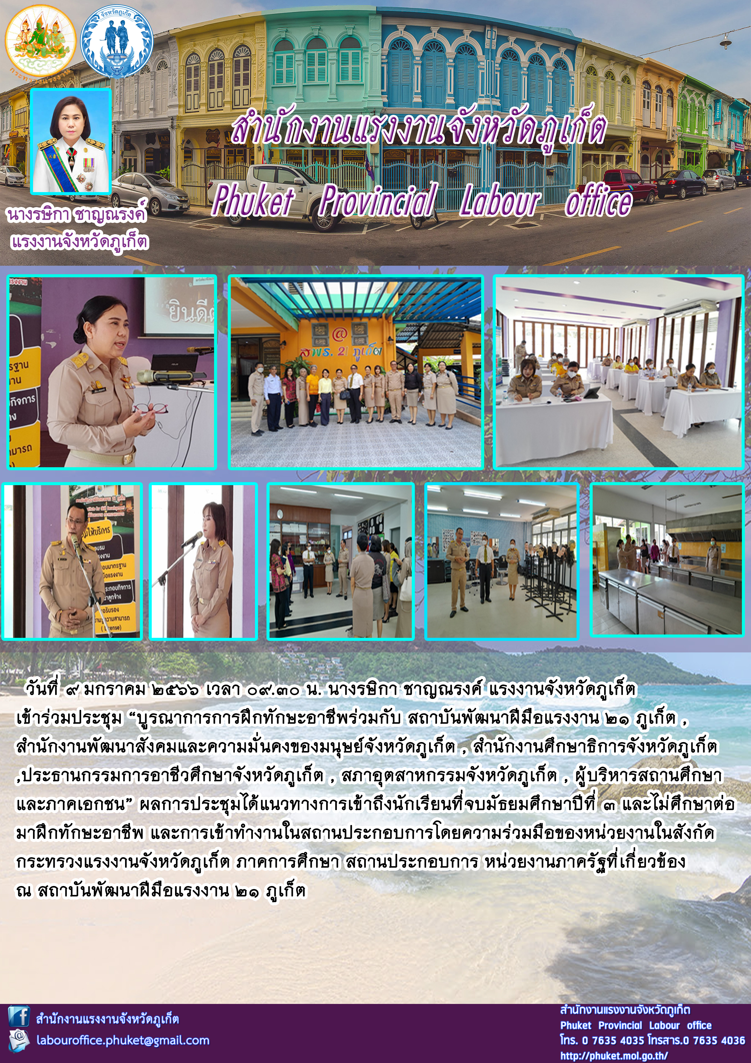 สรจ.ภูเก็ต เข้าร่วมประชุม “บูรณาการการฝึกทักษะอาชีพร่วมกับ สถาบันพัฒนาฝีมือแรงงาน 21 ภูเก็ต , สำนักงานพัฒนาสังคมและความมั่นคงของมนุษย์จังหวัดภูเก็ต , สำนักงานศึกษาธิการจังหวัดภูเก็ต , ประธานกรรมการอาชีวศึกษาจังหวัดภูเก็ต , สภาอุตสาหกรรมจังหวัดภูเก็ต , ผู้บริหารสถานศึกษา และภาคเอกชน”