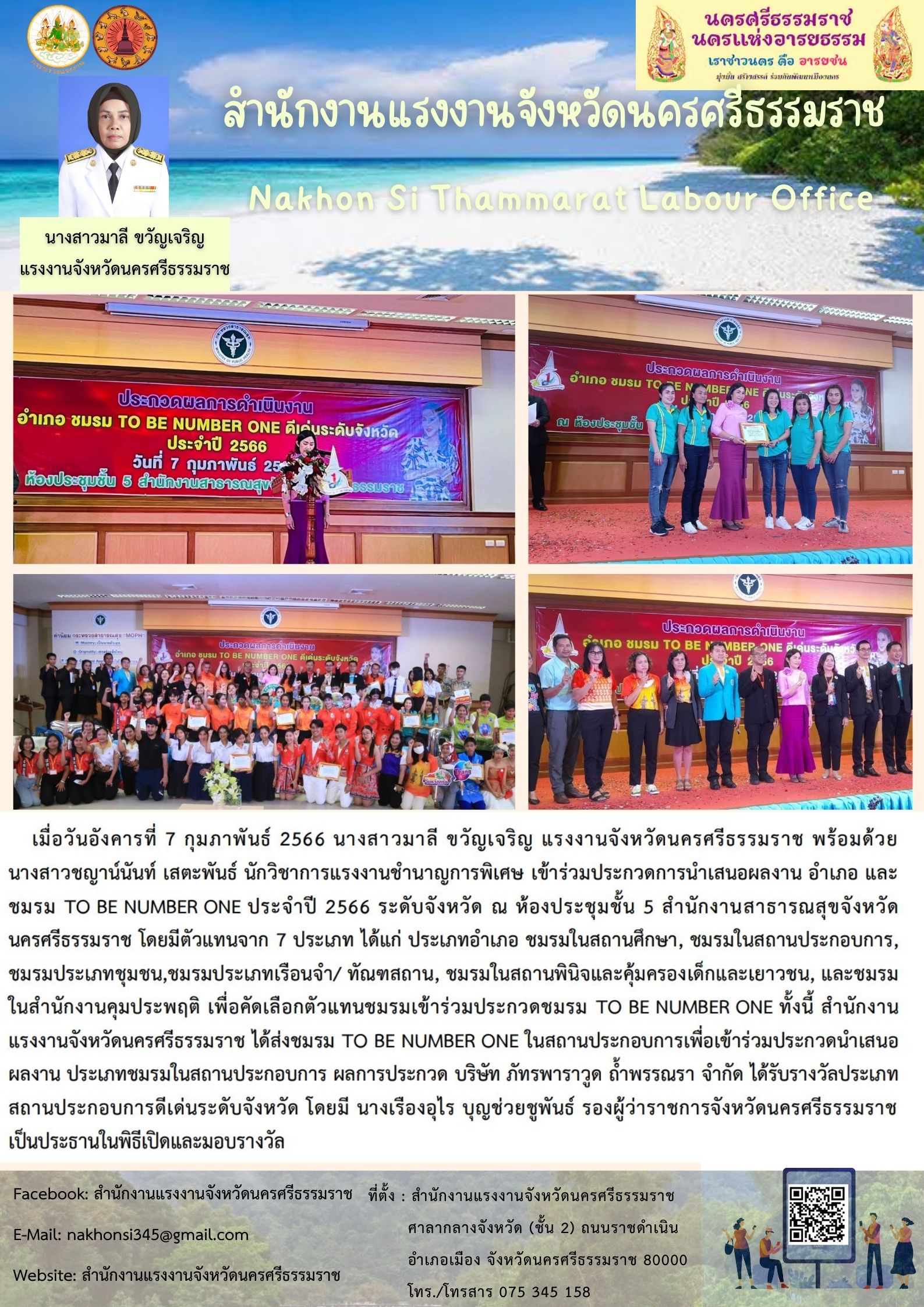 สรจ.นครศรีธรรมราช เข้าร่วมกิจกรรมการประกวดนำเสนอผลงาน อำเภอ และชมรม TO BE NUMBER ONE ประจำปี 2566 ระดับจังหวัด ณ ห้องประชุมชั้น 5 สำนักงานสาธารณสุขจังหวัดนครศรีธรรมราช โดยมี นางเรืองอุไร บุญช่วยชูพันธ์ รองผู้ว่าราชการจังหวัดนครศรีธรรมราช เป็นประธานพิธีเปิดและมอบรางวัล