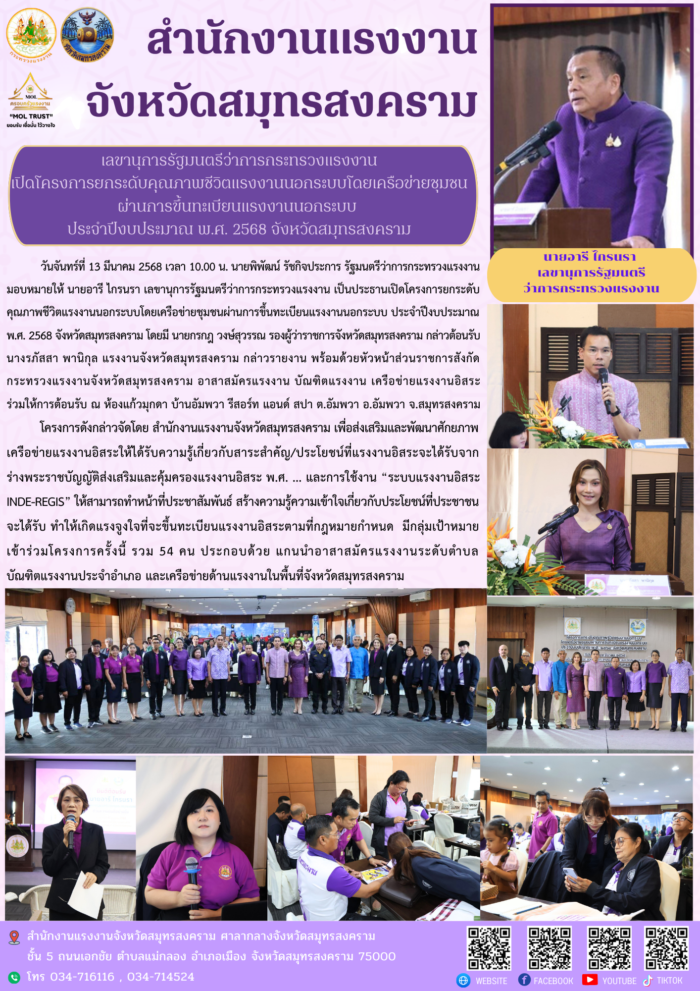 วันจันทร์ที่ 13 มีนาคม 2568 เวลา 10.00 น. นายพิพัฒน์ รัชกิจประการ รัฐมนตรีว่าการกระทรวงแรงงาน มอบหมายให้ นายอารี ไกรนรา เลขานุการรัฐมนตรีว่าการกระทรวงแรงงาน เป็นประธานเปิดโครงการยกระดับคุณภาพชีวิตแรงงานนอกระบบโดยเครือข่ายชุมชนผ่านการขึ้นทะเบียนแรงงานนอกระบบ ประจำปีงบประมาณ พ.ศ. 2568 จังหวัดสมุทรสงคราม โดยมี นายกรกฎ วงษ์สุวรรณ รองผู้ว่าราชการจังหวัดสมุทรสงคราม กล่าวต้อนรับ นางรภัสสา พานิกุล แรงงานจังหวัดสมุทรสงคราม กล่าวรายงาน พร้อมด้วยหัวหน้าส่วนราชการสังกัดกระทรวงแรงงานจังหวัดสมุทรสงคราม อาสาสมัครแรงงาน บัณฑิตแรงงาน เครือข่ายแรงงานอิสระ ร่วมให้การต้อนรับ ณ ห้องแก้วมุกดา บ้านอัมพวา รีสอร์ท แอนด์ สปา ต.อัมพวา อ.อัมพวา จ.สมุทรสงคราม