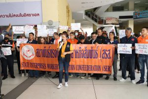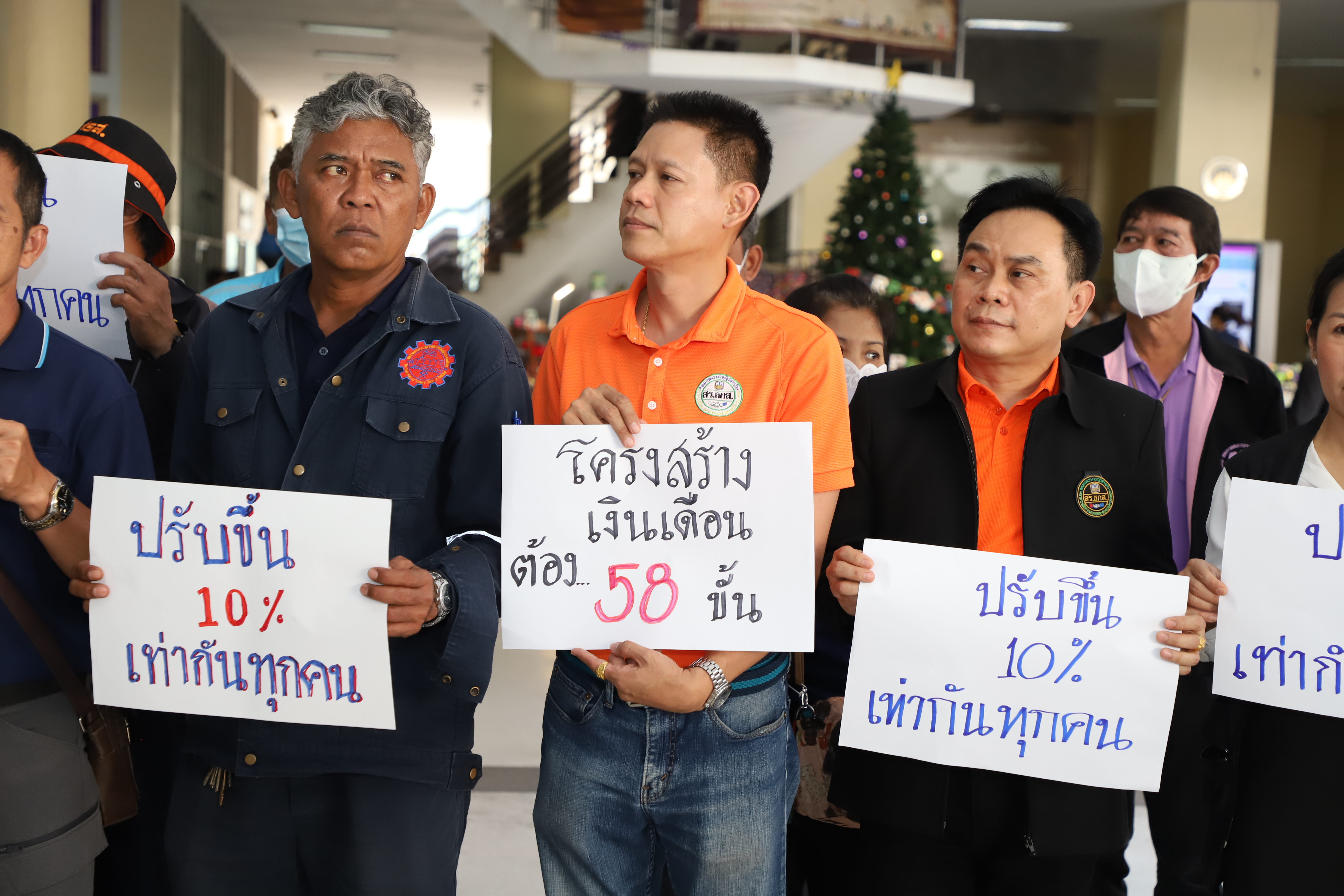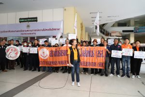On December 12, 2023, at 10.00 hours, the Labour Minister, Mr. Phiphat Ratchakitprakarn, assigned the Secretariat to the Labour Minister, Mr. Aree Krainara, to receive a letter of requests from the State Enterprises Workers’ Relations Confederation, led by the Secretary-General of the State Enterprises Workers’ Relations Confederation, Mr. Manop Kuerat. He paid a visit to submit a letter regarding a proposal to adjust salaries and improve the employee salary structure in state enterprises, as well as the minimum wage adjustment, to be taken into consideration at the next meeting of the State Enterprises Workers’ Relations Confederation. He submitted three requests, including: 1. A request for a salary adjustment to state enterprise employees, requesting a 10% increase to cover all groups of state enterprises. 2. A request to improve the salary structure of state enterprise employees, expanding from 53 levels to 58 levels. 3 A request to increase the minimum wage to 492 Baht nationwide and to cover employees in all sectors, in line with the current rising cost of living. The Deputy Permanent Secretary of Labour, Mr. Wannarat Srisuksai, the Labour Minister’s working group, the Department of Labour Protection and Welfare’s Deputy Director-General Ms. Kanchana Poonkaew and relevant officials participated on the first floor of the Ministry of Labour.