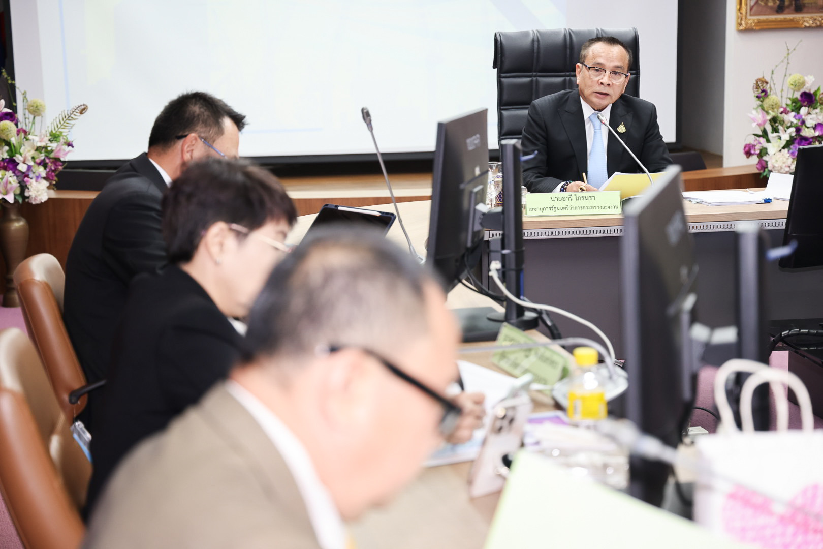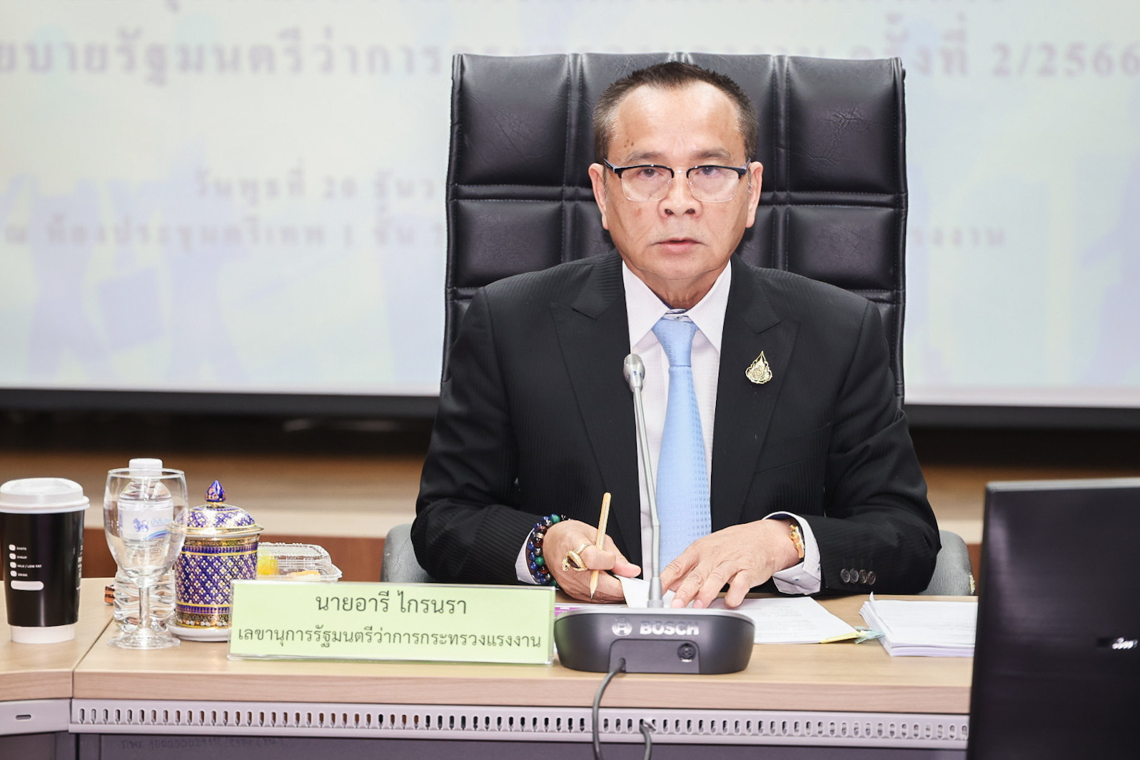 วันที่ 20 ธันวาคม 2566 เวลา 13.30 น. นายพิพัฒน์ รัชกิจประการ รัฐมนตรีว่าการกระทรวงแรงงาน มอบหมายให้ นายอารี ไกรนรา เลขานุการรัฐมนตรีว่าการกระทรวงแรงงาน เป็นประธานการประชุมคณะกรรมการติดตามการดำเนินการตามนโยบายรัฐมนตรีว่าการกระทรวงแรงงาน (คตร.) โดยมี นายเดชา พฤกษ์พัฒนรักษ์ รองปลัดกระทรวงแรงงาน นางสาวกรจิรัฏฐ์ พงจันทร์ศธร ผู้ช่วยปลัดกระทรวงแรงงาน และหน่วยงานในสังกัดกระทรวงแรงงานที่เกี่ยวข้อง เข้าร่วมประชุมด้วย ณ ห้องประชุมตรีเทพ 1 ชั้น 7 อาคาร 25 ปี กรมพัฒนาฝีมือแรงงาน ซึ่งที่ประชุมได้พิจารณาผลการดำเนินงานตามนโยบายรัฐมนตรีว่าการกระทรวงแรงงานและข้อสั่งการ ประจำปีงบประมาณ พ.ศ. 2567 และ การแต่งตั้งคณะทำงานเพื่อสนับสนุนการปฏิบัติงานของ คตร.