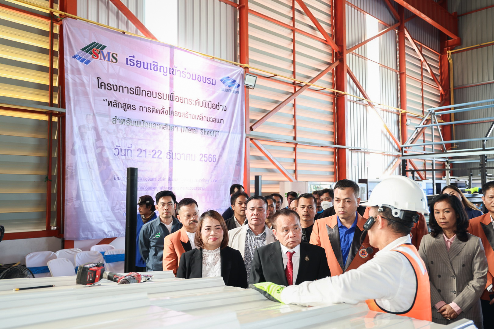 วันที่ 21 ธันวาคม 2566 เวลา 14.00 น. นายอารี ไกรนรา เลขานุการรัฐมนตรีว่าการกระทรวงแรงงาน เป็นประธานในพิธีเปิดการฝึกอบรมหลักสูตรการติดตั้งหลังคาและผนังเมทัลชีทระดับพื้นฐานตามโครงการปั้นช่างงานดีฝีมือเด่น โดยมี นางจิรวรรณ สุตสุนทร ผู้ตรวจราชการกรมพัฒนาฝีมืแรงงาน เป็นผู้กล่าวรายงาน ณ บริษัท สิชล เม็ททัลชีท จำกัด (สาขา 2) อำเภอลำลูกกา จังหวัดปทุมธานี โดย นายอารีฯ กล่าวว่า ปัจจุบันอุตสาหกรรมเหล็กและก่อสร้าง โดยเฉพาะอาคาร โรงงาน งานก่อสร้าง เป็นต้น นิยมใช้ผลิตภัณฑ์เหล็กรีดเย็น เหล็กโครงสร้างมวลเบาและแผ่นเหล็กเมทัลชีทเป็นส่วนใหญ่ เพราะมีคุณสมบัติ แข็งแรงทนทาน น้ำหนักเบา และการติดตั้งสะดวกรวดเร็ว ประกอบกับเป็นงานที่สามารถสร้างรายได้ที่ดีและมั่นคง จึงเห็นควรที่จะส่งเสริมและพัฒนาทักษะฝีมือให้กับแรงงานในสาขาก่อสร้างอย่างต่อเนื่อง เพื่อให้ช่างติดตั้งผลิตภัณฑ์เหล็กสามารถทำงานได้มาตรฐานทั้งการเลือกใช้วัสดุ และเป็นแรงงานมีทักษะฝีมือที่สูงได้มาตรฐานฝีมือแรงงาน ทันต่อการเปลี่ยนแปลงของเทคโนโลยี และพัฒนาแรงงานให้สอดคล้องกับการขยายตัวของตลาดแรงงาน และแก้ไขปัญหา แรงงานด้านก่อสร้าง