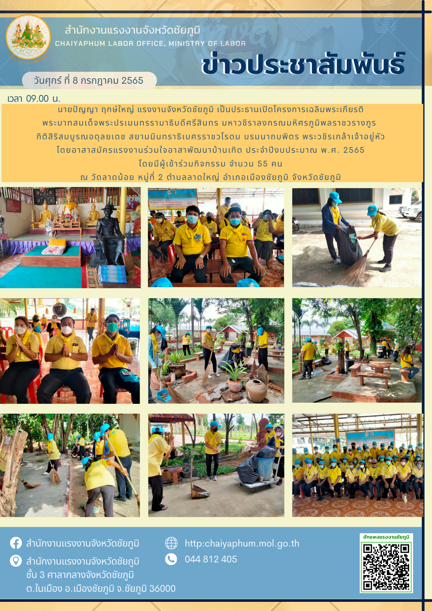 -เวลา 09.00 น.นายปัญญา ฤกษ์ใหญ่ แรงงานจังหวัดชัยภูมิ เป็นประธานเปิดโครงการเฉลิมพระเกียรติพระบาทสมเด็จพระปรเมนทรรามาธิบดีศรีสินทร มหาวชิราลงกรณมหิศรภูมิพลราชวรางกูร กิติสิริสมบูรณอดุลยเดช สยามมินทราธิเบศรราชวโรดม บรมนาถบพิตร พระวชิรเกล้าเจ้าอยู่หัวโดยอาสาสมัครแรงงานร่วมใจอาสาพัฒนาบ้านเกิด ประจำปีงบประมาณ พ.ศ. 2565โดยมีผู้เข้าร่วมกิจกรรม จำนวน 55 คน ณ วัดลาดน้อย หมู่ที่ 2