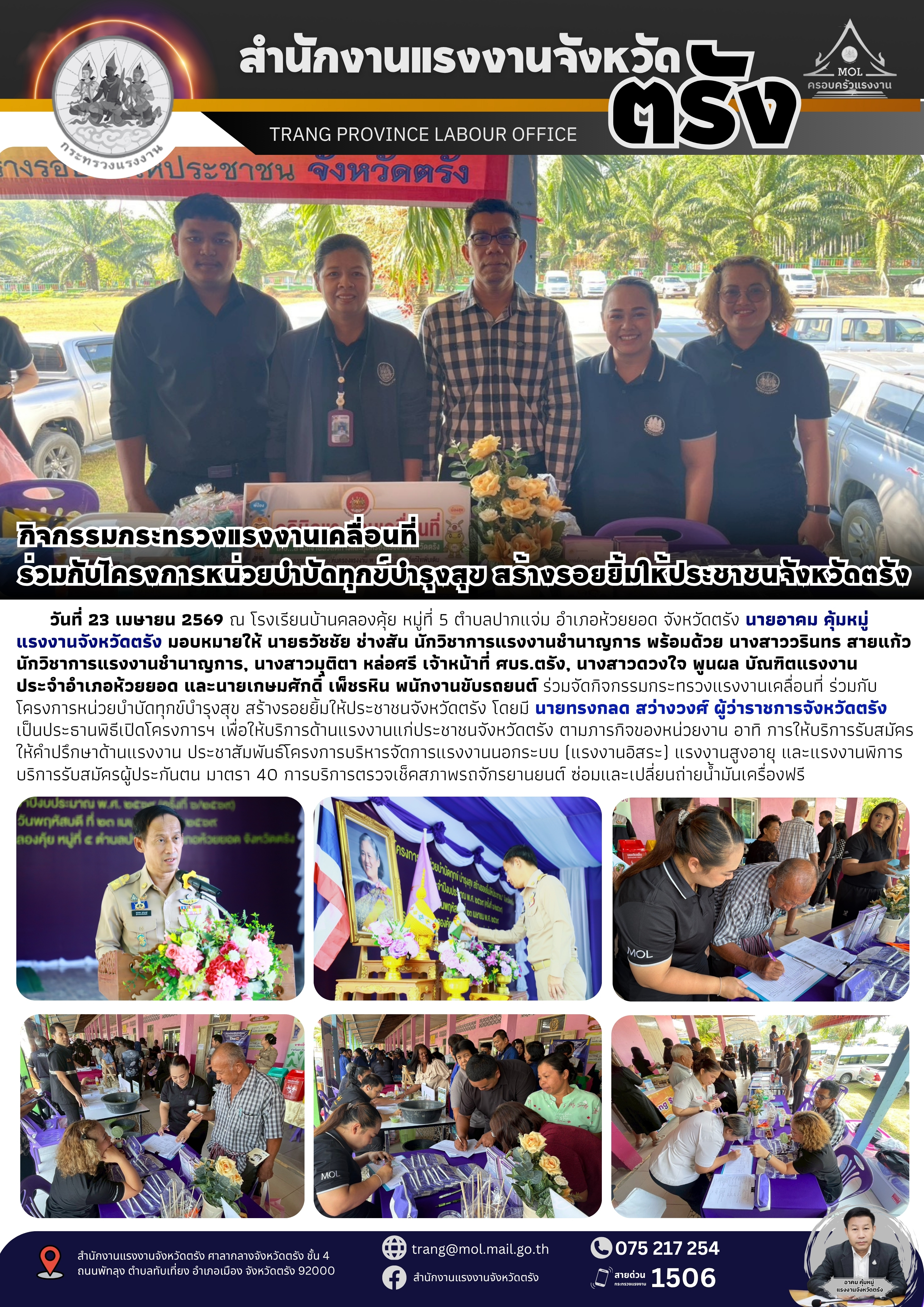 สรจ.ตรัง จัดกิจกรรมกระทรวงแรงงานเคลื่อนที่ ร่วมกับโครงการหน่วยบำบัดทุกข์บำรุงสุข สร้างรอยยิ้มให้ประชาชนจังหวัดตรัง