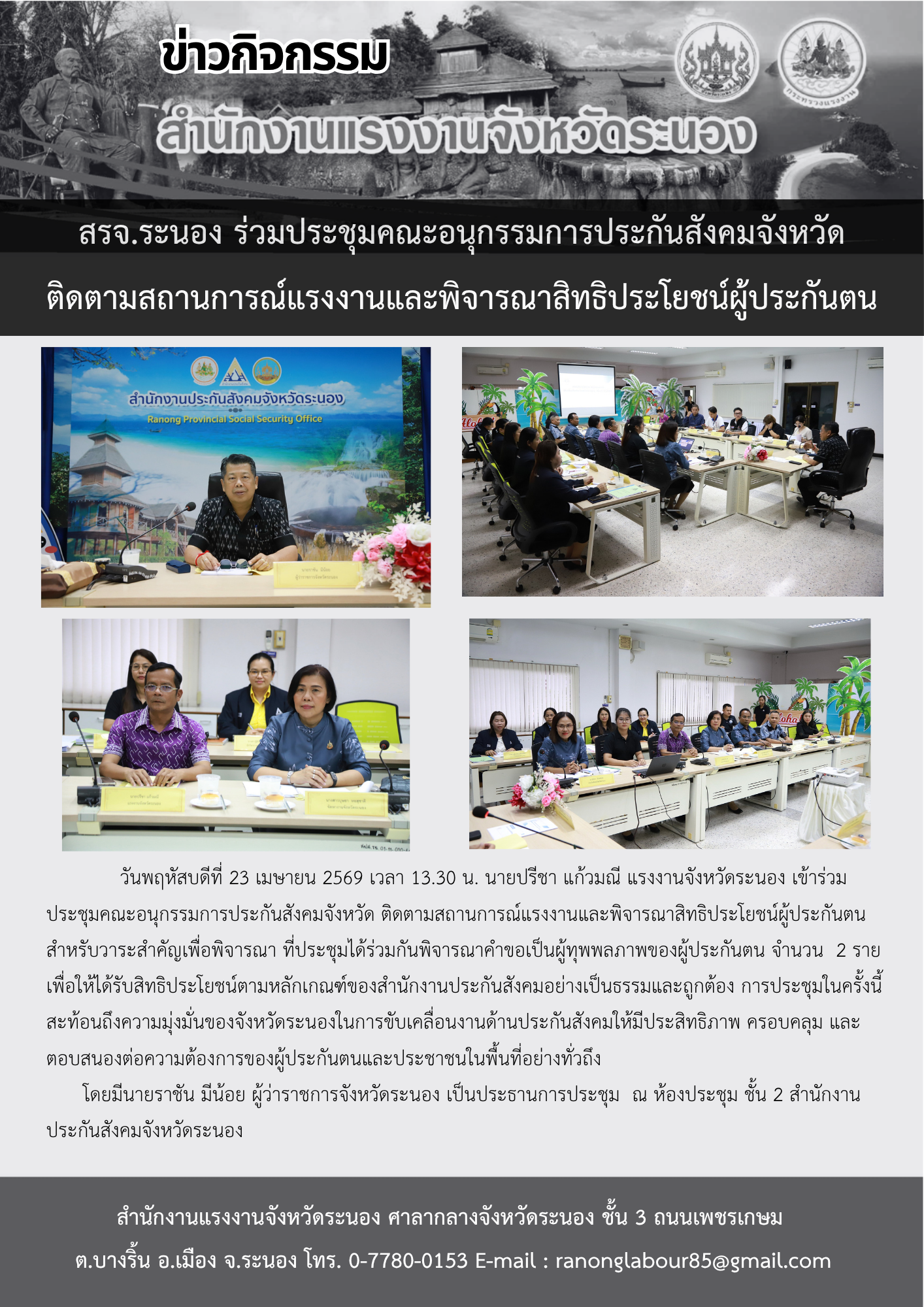 สรจ.ระนอง ร่วมประชุมคณะอนุกรรมการประกันสังคมจังหวัดติดตามสถานการณ์แรงงานและพิจารณาสิทธิประโยชน์ผู้ประกันตน