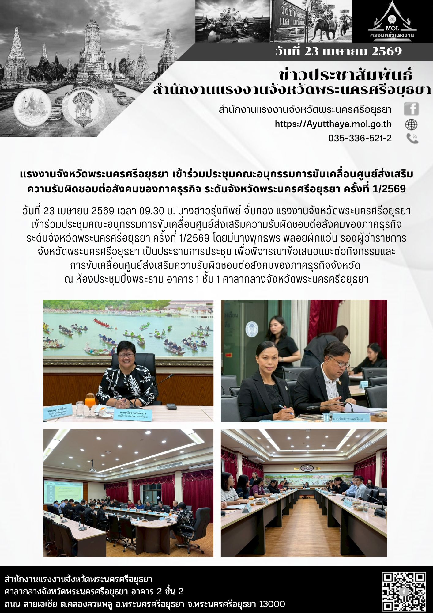 แรงงานจังหวัดพระนครศรีอยุธยา เข้าร่วมประชุมคณะอนุกรรมการขับเคลื่อนศูนย์ส่งเสริมความรับผิดชอบต่อสังคมของภาคธุรกิจ ระดับจังหวัดพระนครศรีอยุธยา ครั้งที่ 1/2569