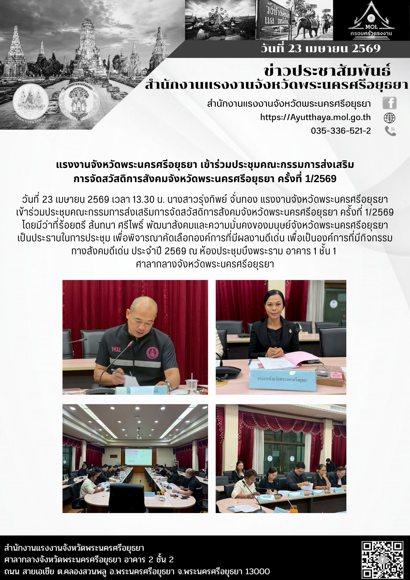 แรงงานจังหวัดพระนครศรีอยุธยา เข้าร่วมประชุมคณะกรรมการส่งเสริม การจัดสวัสดิการสังคมจังหวัดพระนครศรีอยุธยา ครั้งที่ 1/2569