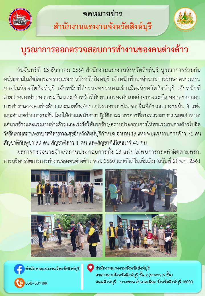 เเรงงานจังหวัดสิงห์บุรีบูรณาการออกตรวจสอบการทำงานของคนต่างด้าวเเละนายจ้างสถานประกอบการ