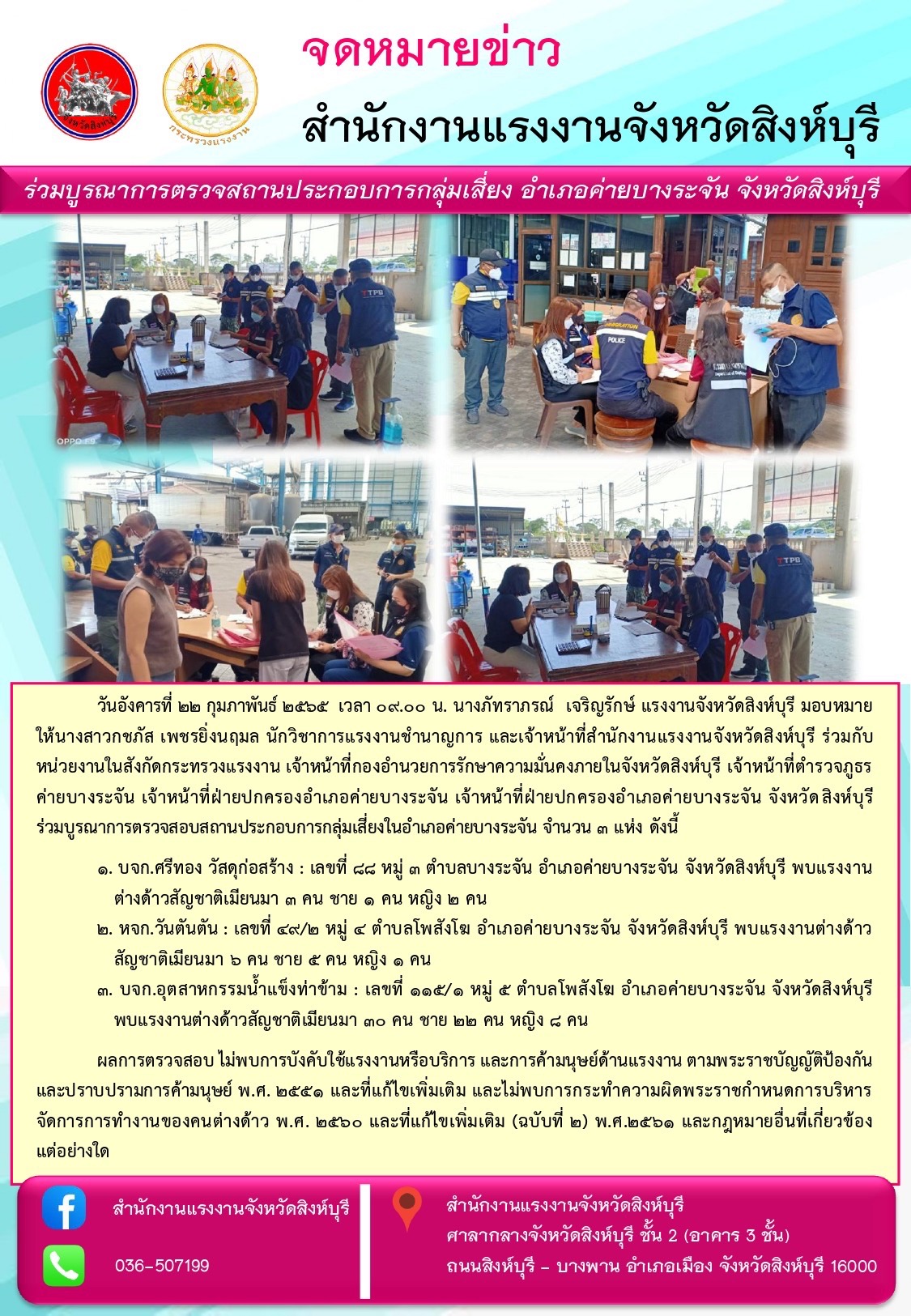 เเรงงานจังหวัดสิงห์บุรี ร่วมบูรณาการตรวจสถานประกอบการกลุ่มเสี่ยงอำเภอค่ายบางระจันจังหวัดสิงห์บุรี