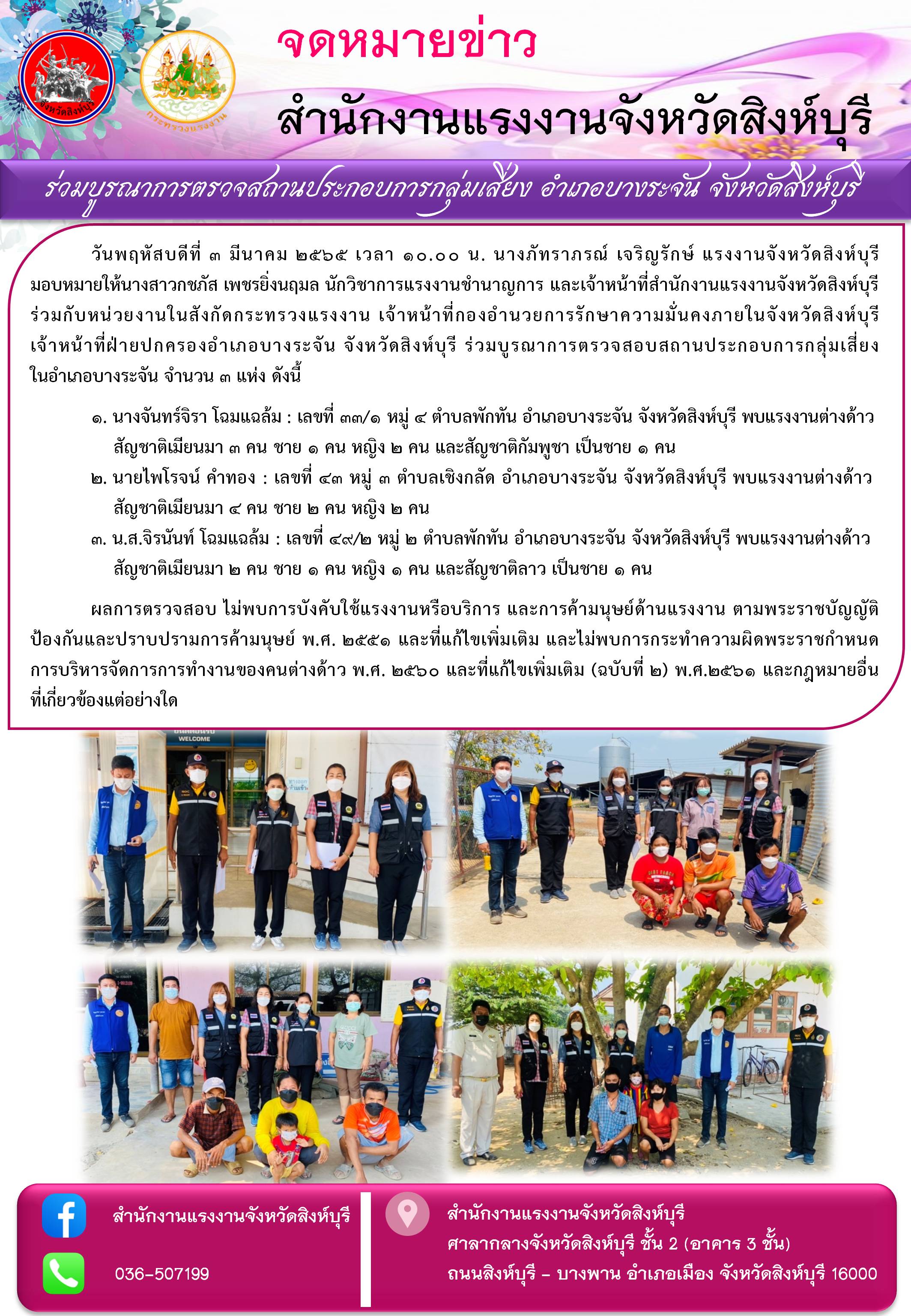 เเรงงานจังหวัดสิงห์บุรีร่วมบูรณาการตรวจสถานประกอบการกลุ่มเสี่ยงอำเภอบางระจันจังหวัดสิงห์บุรี
