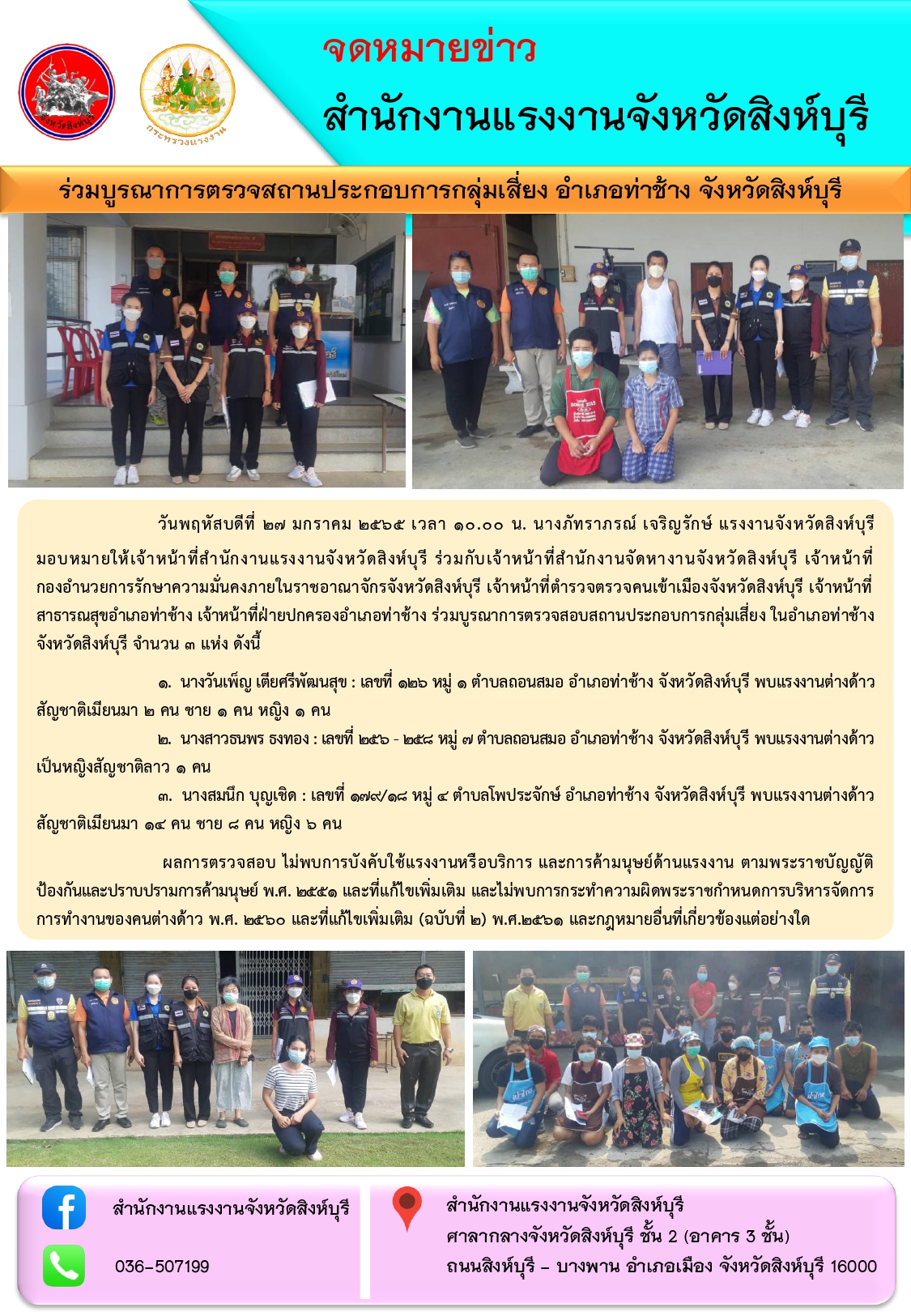 เเรงงานจังหวัดสิงห์บุรี ร่วมบูรณาการตรวจสอบสถานประกอบการกลุ่มเสี่ยง อำเภอท่าช้าง จังหวัดสิงห์บุรี