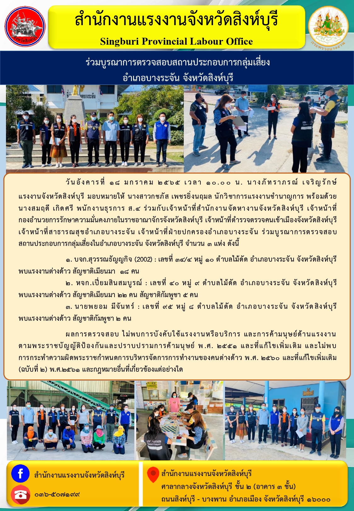 เเรงงานจังหวัดสิงห์บุรีร่วมบูรณาการตรวจสอบสถานประกอบการกลุ่มเสี่ยง อำเภอบางระจัน จังหวัดสิงห์บุรี