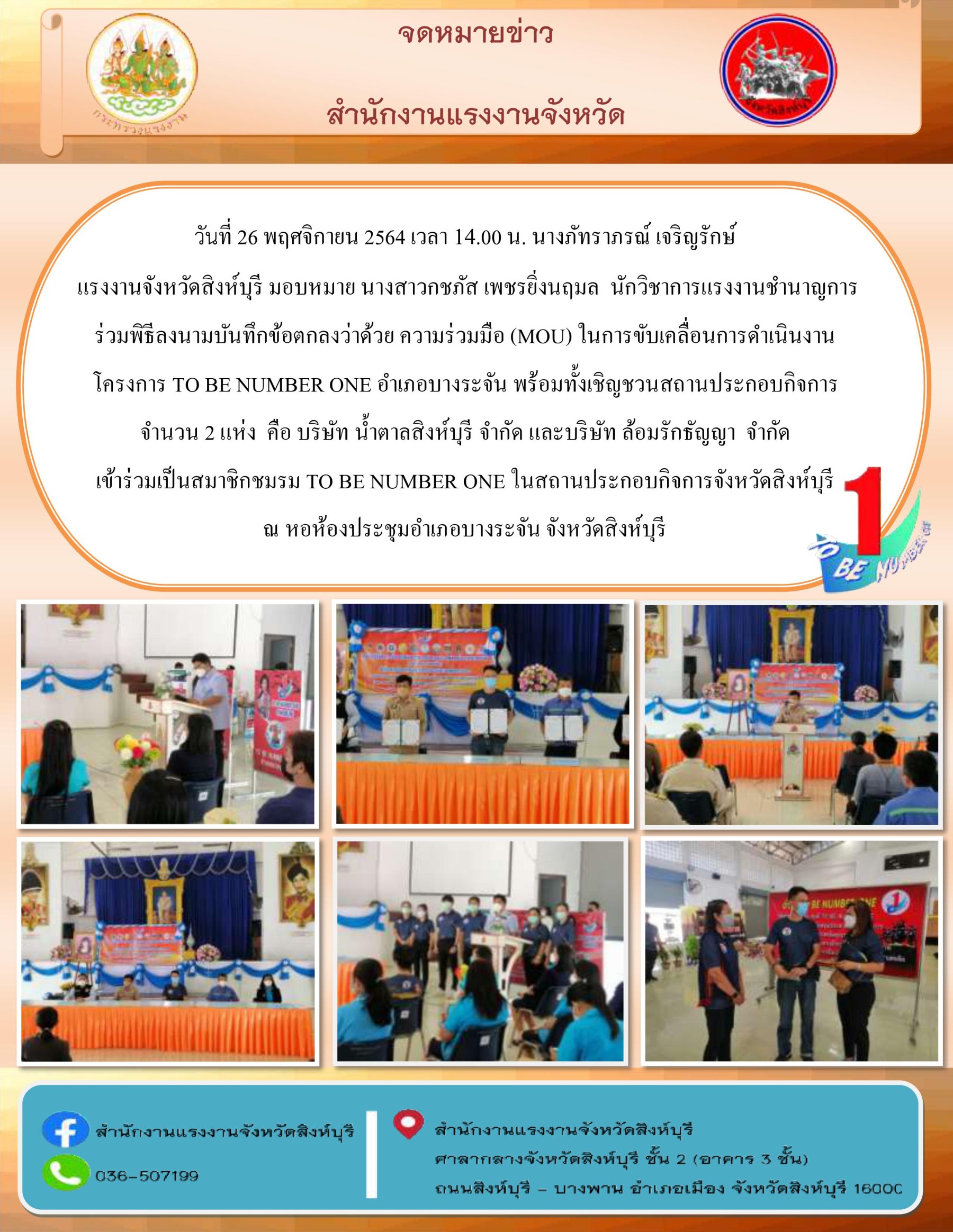 เเรงงานจังหวัดสิงห์บุรีร่วมพิธีลงนามบันทึกข้อตกลงว่าด้วยความร่วมมือ (MOU) ในการขับเคลื่อนการดำเนินงานโครงการ TO BE NUMBER ONE