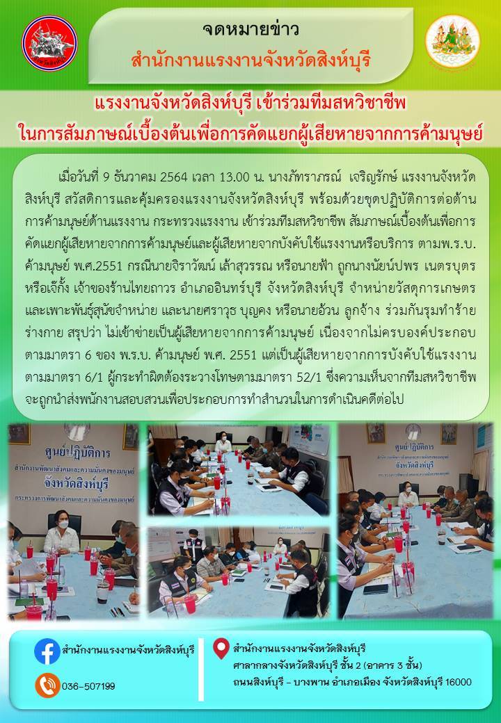 เเรงงานจังหวัดสิงห์บุรีเข้าร่วมทีมสหวิชาชีพในการสัมภาษณ์เบื้องต้นเพื่อการคัดเเยกผู้เสียหายจากการค้ามนุษย์